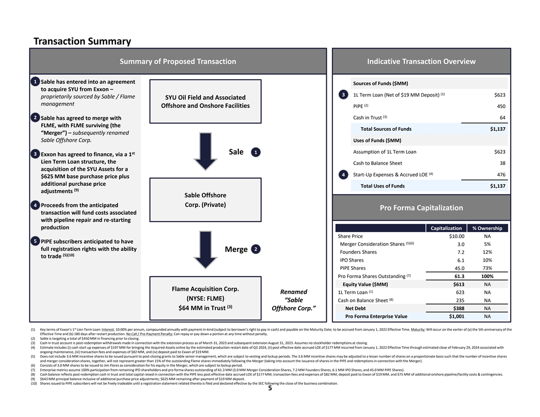 Key Transaction Highlights Sable Offshore Corp. (“Sable”) has entered into an agreement to merge with Flame Acquisition Corp. (“FLME”, “Flame”, or the “Company”). Sable has separately agreed to acquire the Santa Ynez Field and associated assets (“Santa Ynez”, “SYU”, or the “Acquired Assets”) from ExxonMobil (“Exxon”) Proprietarily sourced, bi-laterally negotiated, and seller financed Santa Ynez Unit Acquisition n Identified by Sable / Flame executives as a foundational public company Background asset and exclusively negotiated with Exxon st n Purchase price is financed by a 1 Lien Term Loan held by Exxon Santa Ynez is a massive oil-weighted resource n Three offshore platforms located in federal waters north of Santa Barbara, California High Quality n Wholly owned onshore production treatment facilities Asset n Discovered in 1968 with significant production history n >100 identified infill drilling and step-out opportunities, along with (1) workovers and ESP installation on existing wellbores Asset re-start process well underway n Facilities well maintained during downtime; ~34 MBoe/d average gross Las Flores Canyon Processing Facility Pathway to production in 2014 prior to shut-in for pipeline leak Production n March 2020 consent decree establishes path for pipeline restart; permitting process well underway n Target online date of July 2024 Sable management are well-qualified to operate Santa Ynez (2) Highly-Qualified n Exemplary track record of operating safely in California and offshore Stewards n Demonstrated expertise via numerous awards from state and federal agencies of the Asset n Developing strategy for carbon capture and underground storage (“CCUS”) leveraging existing infrastructure and access (1) Electric submersible pump. (2) While at Plains Exploration & Production, current Sable management team operated platforms included Irene at Point Pedernales and Hidalgo, Harvest and Hermosa at Point Arguello. 4