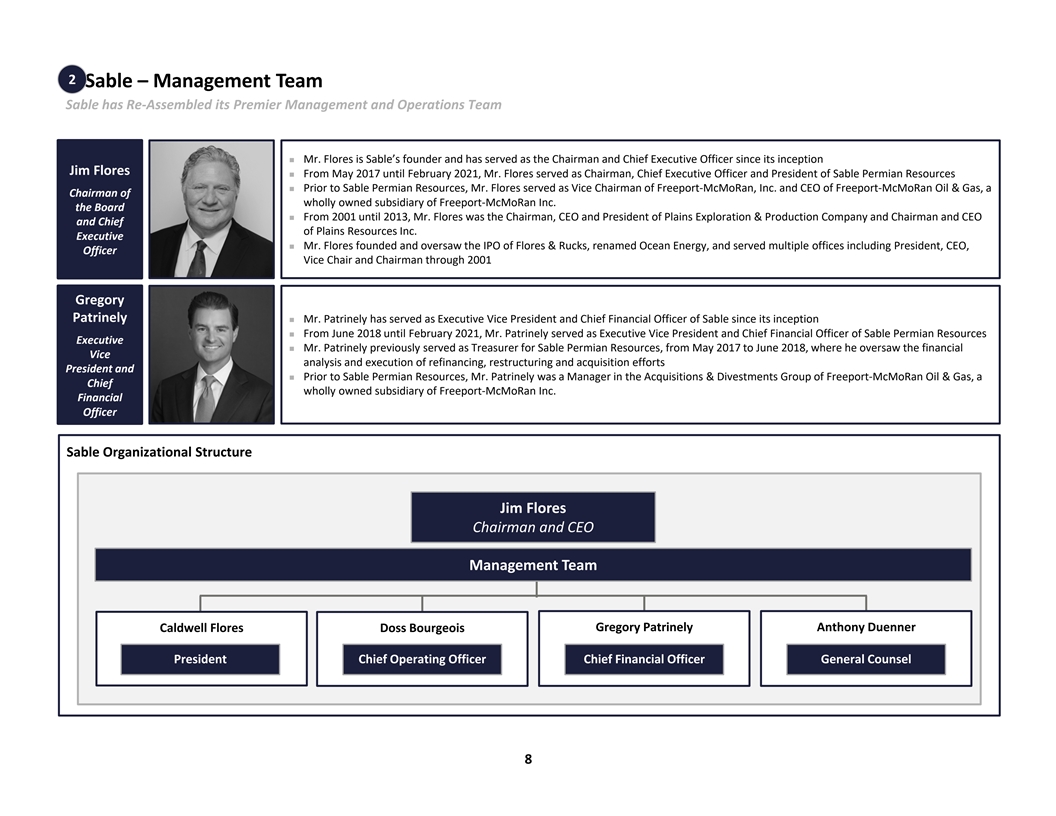 1 Strategically Aligned with Flame Thesis n Sable management targeting n Asset acquisition metrics are very Attractive Conservative long-term leverage ratios of ~1.0x favorable against intrinsic value üü to maximize flexibility for Returns Leverage Profile and public benchmarking distributions and development n Modest reinvestment required in n Resource life of 50+ years with an Significant Free the near-term as Sable focuses on Significant 8% shallow base forecast decline (1) ü workovers and ESP installation ü profile for the initial five years Cash Flow Resource Life on existing wellbores after production re-start n De-risked reservoir first n Wholly owned pipeline and Access to discovered in the 1960’s processing will preserve margin Substantial Infrastructure & üü Upside n Potential for additional growth n Oil sales contracts linked to Brent End Markets with accelerated development Crude n Sable is well-qualified to own the (2) asset given our HS&E and High n 100% Sable operated with HS&E operational track record Operational ü favorable 16.4% royalty burdenü Stewardship Controln Opportunity for CCUS utilizing existing assets (1) Electrical submersible pump. (2) Health, safety and environment. 7