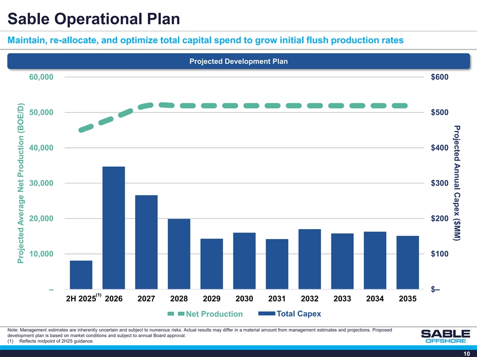 Harmony Platform Commenced Restart Production Initial well tests at Harmony Platform have exceeded expectations (1) Production Restart: May 15, 2025 (2) n Estimated 2H25 net production: ~15.0 – 19.0 MBoe/d Harmony Platform n Wells: 32 (3) n Available well slots: 23-27 (4) Estimated Production Restart: July 2025 (2) n Estimated 2H25 net production: ~19.0 – 23.0 MBoe/d Heritage Platform n Wells: 44 (3) n Available well slots: 15-17 (4) Estimated Production Restart: August 2025 (2) n Estimated 2H25 net production: ~6.0 – 8.0 MBoe/d Hondo Platform n Wells: 26 (3) n Available well slots: 10 (1) SYU-produced oil is being held in the Company’s storage tanks at LFC while Sable completes the final hydrotest in order to meet the final operational condition to restart the Las Flores Pipeline System as outlined in the Consent Decree. Initial restart of production is higher than expected sustained production and there is uncertainty regarding the amount and timing of production decline from recently opened wells. (2) Updated guidance amount is based on production levels at the time of the 2015 shut in, initial Harmony well results, the anticipated restart of production at Heritage and Hondo in Q3 2025, management's best estimates based upon numerous technical data points such as bottom-hole pressures, material balance calculations and estimates, reservoir simulations, management experience operating producing assets offshore California, and planned capital expenditures. Deviations from the anticipated timing and magnitude of such assumptions may impact actual results. (3) Available well slots include those either actively unused or available for opportunistic reclamation. (4) The timing of restart of production at Heritage and Hondo platforms is subject to numerous risks. Refer to slide “Disclaimer – Forward-Looking Statements”. 9