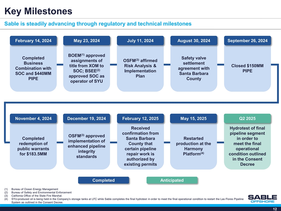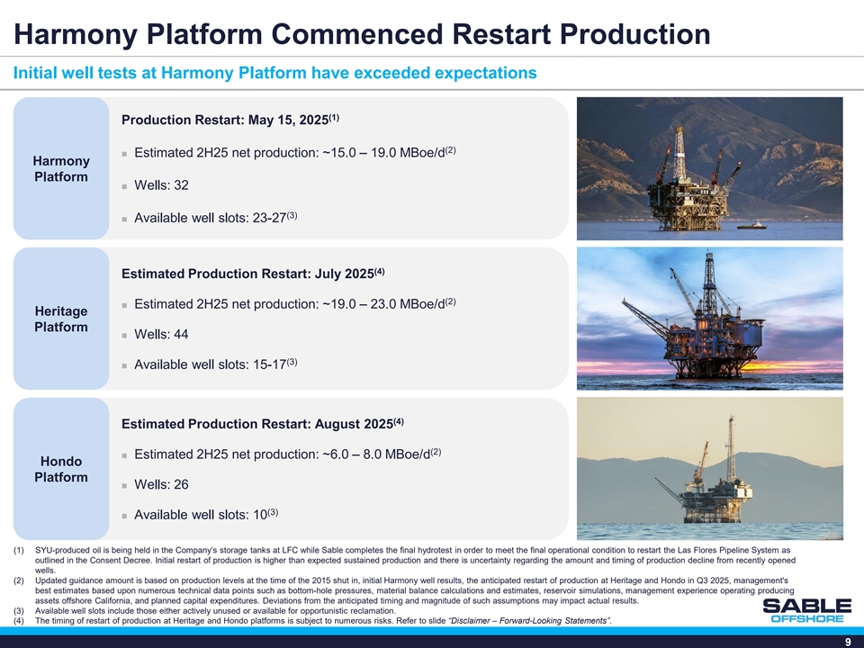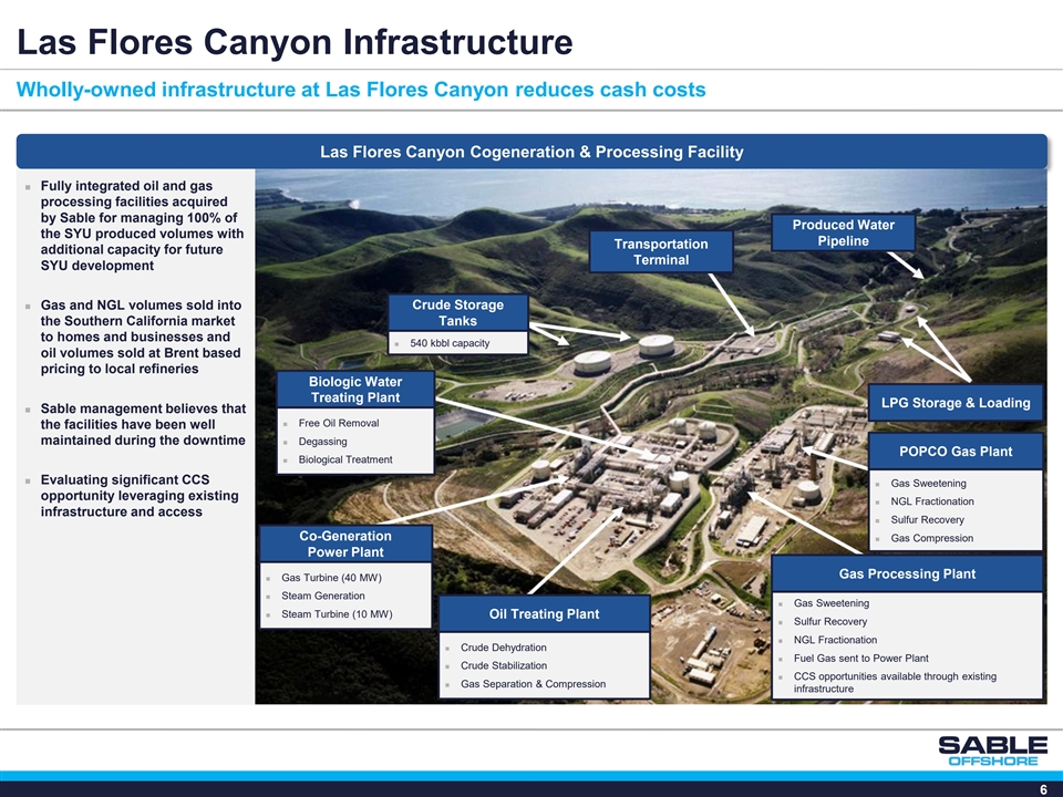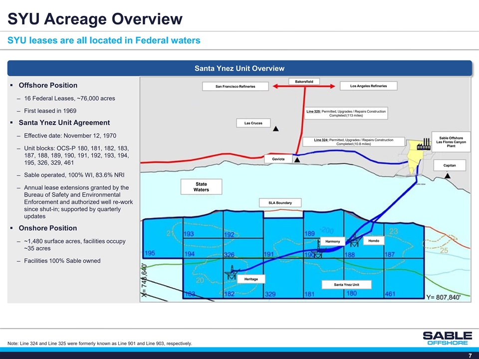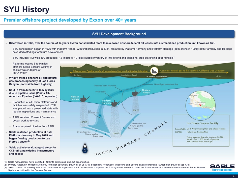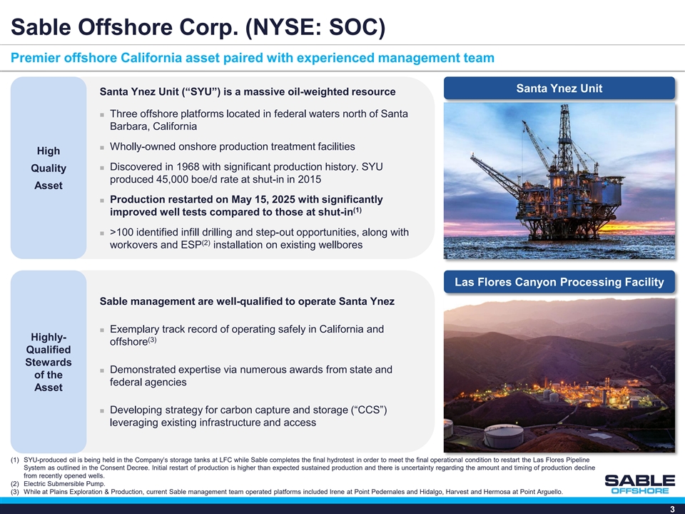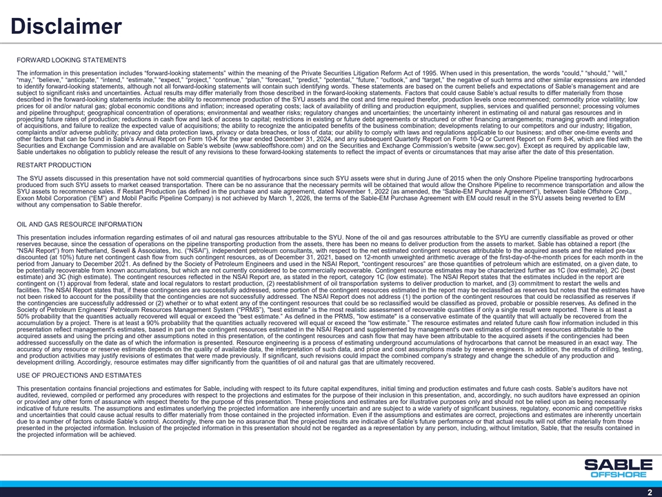 Disclaimer FORWARD LOOKING STATEMENTS The information in this presentation includes “forward-looking statements” within the meaning of the Private Securities Litigation Reform Act of 1995. When used in this presentation, the words “could,” “should,” “will,” “may,” “believe,” “anticipate,” “intend,” “estimate,” “expect,” “project,” “continue,” “plan,” “forecast,” “predict,” “potential,” “future,” “outlook,” and “target,” the negative of such terms and other similar expressions are intended to identify forward-looking statements, although not all forward-looking statements will contain such identifying words. These statements are based on the current beliefs and expectations of Sable’s management and are subject to significant risks and uncertainties. Actual results may differ materially from those described in the forward-looking statements. Factors that could cause Sable’s actual results to differ materially from those described in the forward-looking statements include: the ability to recommence production of the SYU assets and the cost and time required therefor, production levels once recommenced; commodity price volatility; low prices for oil and/or natural gas; global economic conditions and inflation; increased operating costs; lack of availability of drilling and production equipment, supplies, services and qualified personnel; processing volumes and pipeline throughput; geographical concentration of operations; environmental and weather risks; regulatory changes and uncertainties; the uncertainty inherent in estimating oil and natural gas resources and in projecting future rates of production; reductions in cash flow and lack of access to capital; restrictions in existing or future debt agreements or structured or other financing arrangements; managing growth and integration of acquisitions, and failure to realize the expected value of acquisitions; the ability to recognize the anticipated benefits of the business combination; developments relating to our competitors and our industry; litigation, complaints and/or adverse publicity; privacy and data protection laws, privacy or data breaches, or loss of data; our ability to comply with laws and regulations applicable to our business; and other one-time events and other factors that can be found in Sable’s Annual Report on Form 10-K for the year ended December 31, 2024, and any subsequent Quarterly Report on Form 10-Q or Current Report on Form 8-K, which are filed with the Securities and Exchange Commission and are available on Sable’s website (www.sableoffshore.com) and on the Securities and Exchange Commission’s website (www.sec.gov). Except as required by applicable law, Sable undertakes no obligation to publicly release the result of any revisions to these forward-looking statements to reflect the impact of events or circumstances that may arise after the date of this presentation. RESTART PRODUCTION The SYU assets discussed in this presentation have not sold commercial quantities of hydrocarbons since such SYU assets were shut in during June of 2015 when the only Onshore Pipeline transporting hydrocarbons produced from such SYU assets to market ceased transportation. There can be no assurance that the necessary permits will be obtained that would allow the Onshore Pipeline to recommence transportation and allow the SYU assets to recommence sales. If Restart Production (as defined in the purchase and sale agreement, dated November 1, 2022 (as amended, the “Sable-EM Purchase Agreement”), between Sable Offshore Corp., Exxon Mobil Corporation (“EM”) and Mobil Pacific Pipeline Company) is not achieved by March 1, 2026, the terms of the Sable-EM Purchase Agreement with EM could result in the SYU assets being reverted to EM without any compensation to Sable therefor. OIL AND GAS RESOURCE INFORMATION This presentation includes information regarding estimates of oil and natural gas resources attributable to the SYU. None of the oil and gas resources attributable to the SYU are currently classifiable as proved or other reserves because, since the cessation of operations on the pipeline transporting production from the assets, there has been no means to deliver production from the assets to market. Sable has obtained a report (the “NSAI Report”) from Netherland, Sewell & Associates, Inc. (“NSAI”), independent petroleum consultants, with respect to the net estimated contingent resources attributable to the acquired assets and the related pre-tax discounted (at 10%) future net contingent cash flow from such contingent resources, as of December 31, 2021, based on 12-month unweighted arithmetic average of the first-day-of-the-month prices for each month in the period from January to December 2021. As defined by the Society of Petroleum Engineers and used in the NSAI Report, “contingent resources” are those quantities of petroleum which are estimated, on a given date, to be potentially recoverable from known accumulations, but which are not currently considered to be commercially recoverable. Contingent resource estimates may be characterized further as 1C (low estimate), 2C (best estimate) and 3C (high estimate). The contingent resources reflected in the NSAI Report are, as stated in the report, category 1C (low estimate). The NSAI Report states that the estimates included in the report are contingent on (1) approval from federal, state and local regulators to restart production, (2) reestablishment of oil transportation systems to deliver production to market, and (3) commitment to restart the wells and facilities. The NSAI Report states that, if these contingencies are successfully addressed, some portion of the contingent resources estimated in the report may be reclassified as reserves but notes that the estimates have not been risked to account for the possibility that the contingencies are not successfully addressed. The NSAI Repor