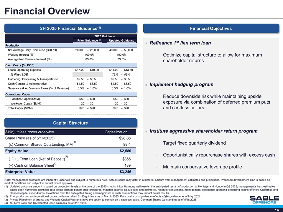Key Milestones Sable is steadily advancing through regulatory and technical milestones February 14, 2024 May 23, 2024 July 11, 2024 August 30, 2024 September 26, 2024 (1) BOEM approved Completed Safety valve (3) assignments of OSFM affirmed Business settlement title from XOM to Risk Analysis & Closed $150MM Combination with agreement with (2) SOC; BSEE Implementation PIPE SOC and $440MM Santa Barbara approved SOC as Plan PIPE County operator of SYU November 4, 2024 December 19, 2024 February 12, 2025 May 15, 2025 Q2 2025 Received Hydrotest of final confirmation from pipeline segment (3) OSFM approved Completed Santa Barbara Restarted in order to implementation of redemption of County that production at the meet the final enhanced pipeline public warrants certain pipeline Harmony operational integrity (4) for $183.5MM repair work is Platform condition outlined standards authorized by in the Consent existing permits Decree Completed Anticipated (1) Bureau of Ocean Energy Management (2) Bureau of Safety and Environmental Enforcement (3) California Office of the State Fire Marshal. (4) SYU-produced oil is being held in the Company’s storage tanks at LFC while Sable completes the final hydrotest in order to meet the final operational condition to restart the Las Flores Pipeline System as outlined in the Consent Decree. 12