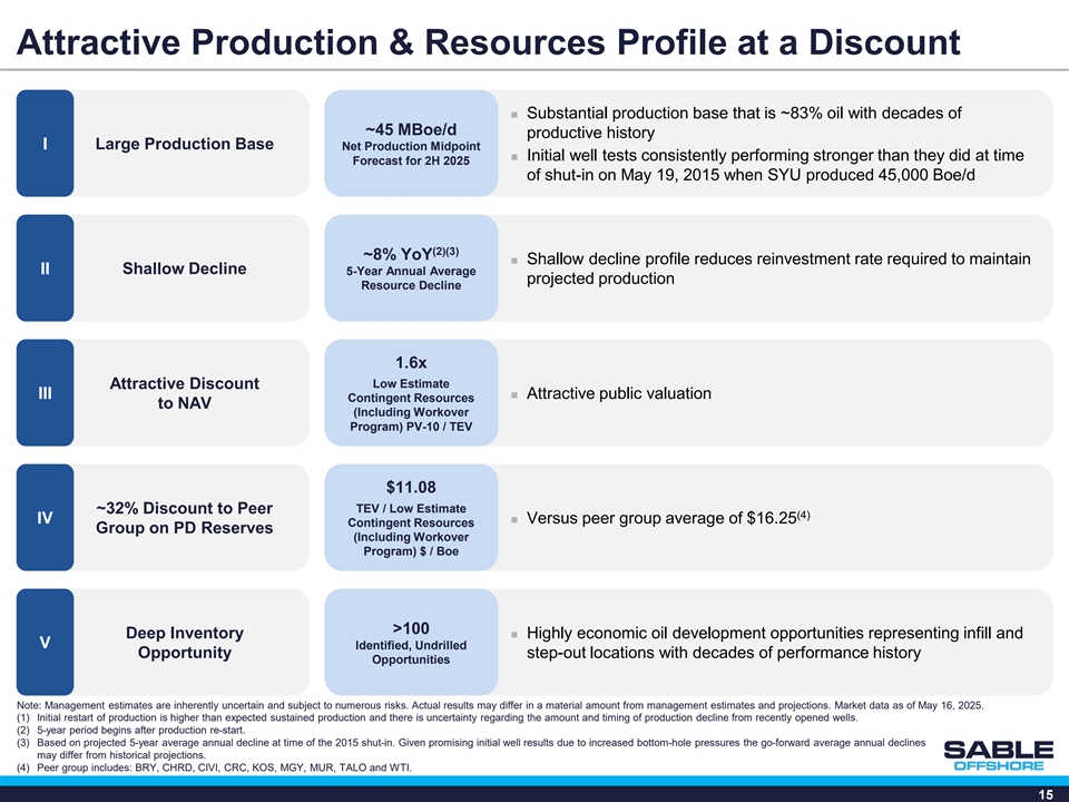 Financial Overview (1) 2H 2025 Financial Guidance Financial Objectives 2H25 Guidance (2) Prior Guidance Updated Guidance st n Refinance 1 lien term loan Production Net Average Daily Production (BOE/D) 20,000 ‒ 25,000 40,000 ‒ 50,000 Working Interest (%) 100.0% 100.0% ‒ Optimize capital structure to allow for maximum Average Net Revenue Interest (%) 83.6% 83.6% shareholder returns Cash Costs ($ / BOE) Lease Operating Expense $17.00 ‒ $19.00 $11.00 ‒ $13.50 % Fixed LOE 75% ‒ 85% Gathering, Processing & Transportation $2.50 ‒ $3.50 $2.50 ‒ $3.50 Cash General & Administrative $4.50 ‒ $5.50 $2.50 ‒ $3.50 n Implement hedging program Severance & Ad Valorem Taxes (% of Revenue) 0.5% ‒ 1.0% 0.5% ‒ 1.0% Operational Capex ‒ Reduce downside risk while maintaining upside Facilities Capex ($MM) $50 ‒ $60 $50 ‒ $60 exposure via combination of deferred premium puts Workover Capex ($MM) 20 ‒ 30 20 ‒ 30 Total Capex ($MM) $70 ‒ $90 $70 ‒ $90 and costless collars Capital Structure n Institute aggressive shareholder return program $MM, unless noted otherwise Capitalization Share Price (as of 5/16/2025) $28.86 (3) ‒ Target fixed quarterly dividend (x) Common Shares Outstanding, MM 89.4 Equity Value $2,580 ‒ Opportunistically repurchase shares with excess cash (4) (+) 1L Term Loan (Net of Deposit) $855 (3) (‒) Cash on Balance Sheet 189 ‒ Maintain conservative leverage profile Enterprise Value $3,246 Note: Management estimates are inherently uncertain and subject to numerous risks. Actual results may differ in a material amount from management estimates and projections. Proposed development plan is based on market conditions and subject to annual Board approval. (1) Updated guidance amount is based on production levels at the time of the 2015 shut in, initial Harmony well results, the anticipated restart of production at Heritage and Hondo in Q3 2025, management's best estimates based upon numerous technical data points such as bottom-hole pressures, material balance calculations and estimates, reservoir simulations, management experience operating producing assets offshore California, and planned capital expenditures. Deviations from the anticipated timing and magnitude of such assumptions may impact actual results. (2) Prior production and operational capex guidance reflect 2H25 guidance as of March 2025. Prior cash costs guidance reflects 4Q24 guidance as of May 2024. (3) Private Placement Warrants and Working Capital Warrants have the option to convert on a cashless basis. Common Shares Outstanding as of 5/16/2025. (4) 1L Term Loan and Unrestricted Cash balances as of 3/31/2025. 14