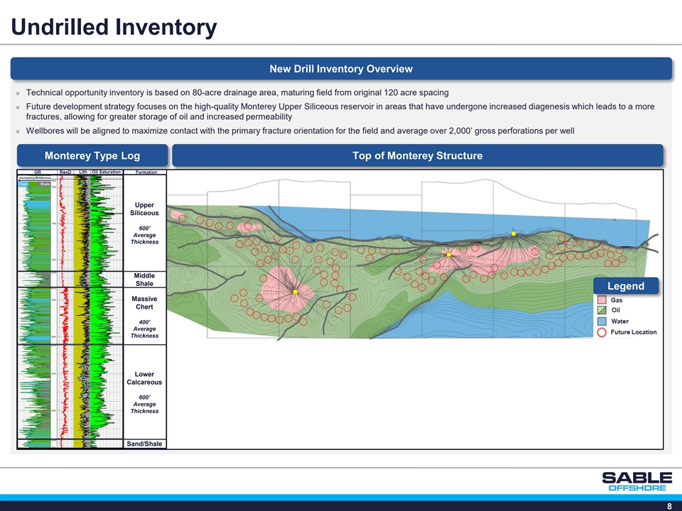 Undrilled Inventory New Drill Inventory Overview n Technical opportunity inventory is based on 80-acre drainage area, maturing field from original 120 acre spacing n Future development strategy focuses on the high-quality Monterey Upper Siliceous reservoir in areas that have undergone increased diagenesis which leads to a more fractures, allowing for greater storage of oil and increased permeability n Wellbores will be aligned to maximize contact with the primary fracture orientation for the field and average over 2,000’ gross perforations per well Monterey Type Log Top of Monterey Structure Upper Siliceous 600’ Average Thickness Middle Shale Legend Massive Chert 400’ Average Thickness Lower Calcareous 600’ Average Thickness Sand/Shale 8