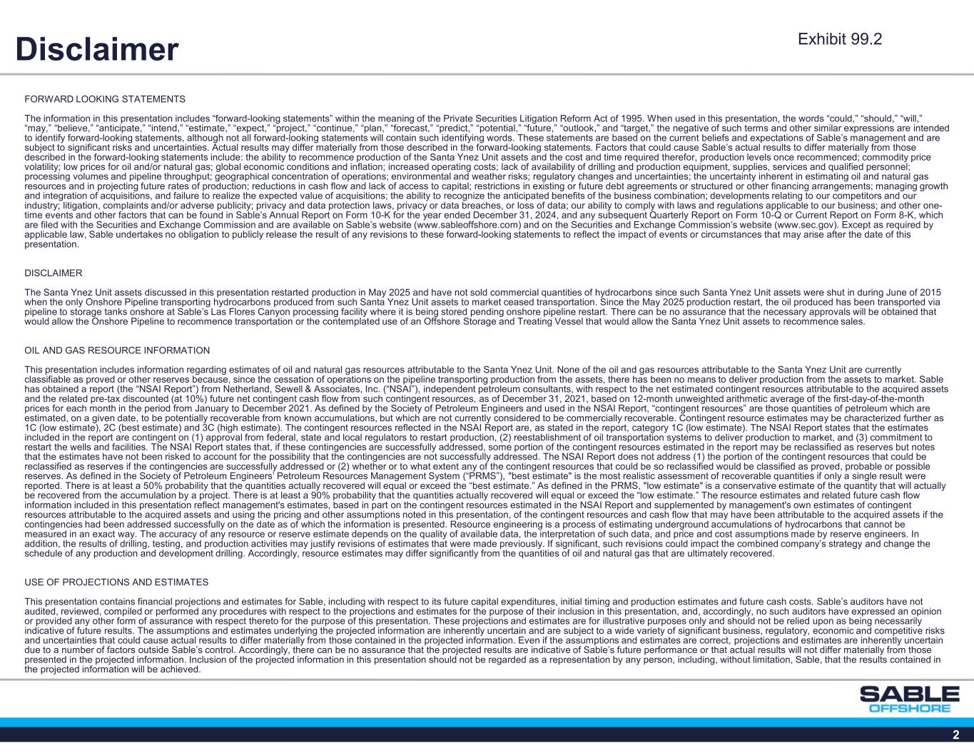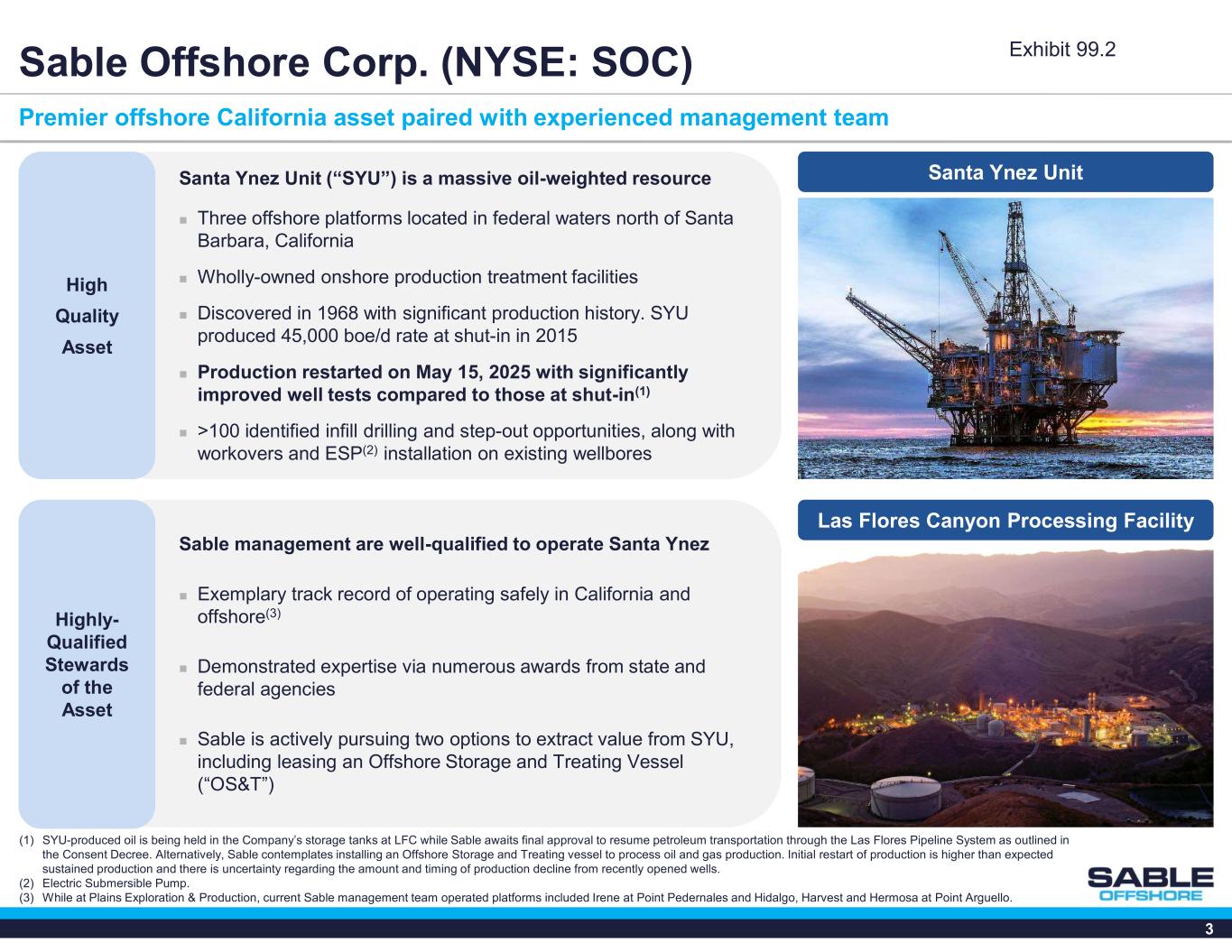 2 FORWARD LOOKING STATEMENTS The information in this presentation includes “forward-looking statements” within the meaning of the Private Securities Litigation Reform Act of 1995. When used in this presentation, the words “could,” “should,” “will,” “may,” “believe,” “anticipate,” “intend,” “estimate,” “expect,” “project,” “continue,” “plan,” “forecast,” “predict,” “potential,” “future,” “outlook,” and “target,” the negative of such terms and other similar expressions are intended to identify forward-looking statements, although not all forward-looking statements will contain such identifying words. These statements are based on the current beliefs and expectations of Sable’s management and are subject to significant risks and uncertainties. Actual results may differ materially from those described in the forward-looking statements. Factors that could cause Sable’s actual results to differ materially from those described in the forward-looking statements include: the ability to recommence production of the Santa Ynez Unit assets and the cost and time required therefor, production levels once recommenced; commodity price volatility; low prices for oil and/or natural gas; global economic conditions and inflation; increased operating costs; lack of availability of drilling and production equipment, supplies, services and qualified personnel; processing volumes and pipeline throughput; geographical concentration of operations; environmental and weather risks; regulatory changes and uncertainties; the uncertainty inherent in estimating oil and natural gas resources and in projecting future rates of production; reductions in cash flow and lack of access to capital; restrictions in existing or future debt agreements or structured or other financing arrangements; managing growth and integration of acquisitions, and failure to realize the expected value of acquisitions; the ability to recognize the anticipated benefits of the business combination; developments relating to our competitors and our industry; litigation, complaints and/or adverse publicity; privacy and data protection laws, privacy or data breaches, or loss of data; our ability to comply with laws and regulations applicable to our business; and other one- time events and other factors that can be found in Sable’s Annual Report on Form 10-K for the year ended December 31, 2024, and any subsequent Quarterly Report on Form 10-Q or Current Report on Form 8-K, which are filed with the Securities and Exchange Commission and are available on Sable’s website (www.sableoffshore.com) and on the Securities and Exchange Commission’s website (www.sec.gov). Except as required by applicable law, Sable undertakes no obligation to publicly release the result of any revisions to these forward-looking statements to reflect the impact of events or circumstances that may arise after the date of this presentation. DISCLAIMER The Santa Ynez Unit assets discussed in this presentation restarted production in May 2025 and have not sold commercial quantities of hydrocarbons since such Santa Ynez Unit assets were shut in during June of 2015 when the only Onshore Pipeline transporting hydrocarbons produced from such Santa Ynez Unit assets to market ceased transportation. Since the May 2025 production restart, the oil produced has been transported via pipeline to storage tanks onshore at Sable’s Las Flores Canyon processing facility where it is being stored pending onshore pipeline restart. There can be no assurance that the necessary approvals will be obtained that would allow the Onshore Pipeline to recommence transportation or the contemplated use of an Offshore Storage and Treating Vessel that would allow the Santa Ynez Unit assets to recommence sales. OIL AND GAS RESOURCE INFORMATION This presentation includes information regarding estimates of oil and natural gas resources attributable to the Santa Ynez Unit. None of the oil and gas resources attributable to the Santa Ynez Unit are currently classifiable as proved or other reserves because, since the cessation of operations on the pipeline transporting production from the assets, there has been no means to deliver production from the assets to market. Sable has obtained a report (the “NSAI Report”) from Netherland, Sewell & Associates, Inc. (“NSAI”), independent petroleum consultants, with respect to the net estimated contingent resources attributable to the acquired assets and the related pre-tax discounted (at 10%) future net contingent cash flow from such contingent resources, as of December 31, 2021, based on 12-month unweighted arithmetic average of the first-day-of-the-month prices for each month in the period from January to December 2021. As defined by the Society of Petroleum Engineers and used in the NSAI Report, “contingent resources” are those quantities of petroleum which are estimated, on a given date, to be potentially recoverable from known accumulations, but which are not currently considered to be commercially recoverable. Contingent resource estimates may be characterized further as 1C (low estimate), 2C (best estimate) and 3C (high estimate). The contingent resources reflected in the NSAI Report are, as stated in the report, category 1C (low estimate). The NSAI Report states that the estimates included in the report are contingent on (1) approval from federal, state and local regulators to restart production, (2) reestablishment of oil transportation systems to deliver production to market, and (3) commitment to restart the wells and facilities. The NSAI Report states that, if these contingencies are successfully addressed, some portion of the contingent resources estimated in the report may be reclassified as reserves but notes that the estimates have not been risked to account for the possibility that the contingencies are not successfully addressed. The NSAI Report does not address (1) t