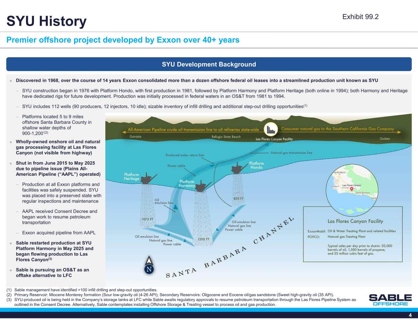 3 Premier offshore California asset paired with experienced management team Sable Offshore Corp. (NYSE: SOC) Santa Ynez Unit Las Flores Canyon Processing Facility Santa Ynez Unit (“SYU”) is a massive oil-weighted resource  Three offshore platforms located in federal waters north of Santa Barbara, California  Wholly-owned onshore production treatment facilities  Discovered in 1968 with significant production history. SYU produced 45,000 boe/d rate at shut-in in 2015  Production restarted on May 15, 2025 with significantly improved well tests compared to those at shut-in(1)  >100 identified infill drilling and step-out opportunities, along with workovers and ESP(2) installation on existing wellbores High Quality Asset Sable management are well-qualified to operate Santa Ynez  Exemplary track record of operating safely in California and offshore(3)  Demonstrated expertise via numerous awards from state and federal agencies  Sable is actively pursuing two options to extract value from SYU, including leasing an Offshore Storage and Treating Vessel (“OS&T”) Highly- Qualified Stewards of the Asset (1) SYU-produced oil is being held in the Company’s storage tanks at LFC while Sable awaits final approval to resume petroleum transportation through the Las Flores Pipeline System as outlined in the Consent Decree. Alternatively, Sable contemplates installing an Offshore Storage and Treating vessel to process oil and gas production. Initial restart of production is higher than expected sustained production and there is uncertainty regarding the amount and timing of production decline from recently opened wells. (2) Electric Submersible Pump. (3) While at Plains Exploration & Production, current Sable management team operated platforms included Irene at Point Pedernales and Hidalgo, Harvest and Hermosa at Point Arguello. Exhibit 99.2