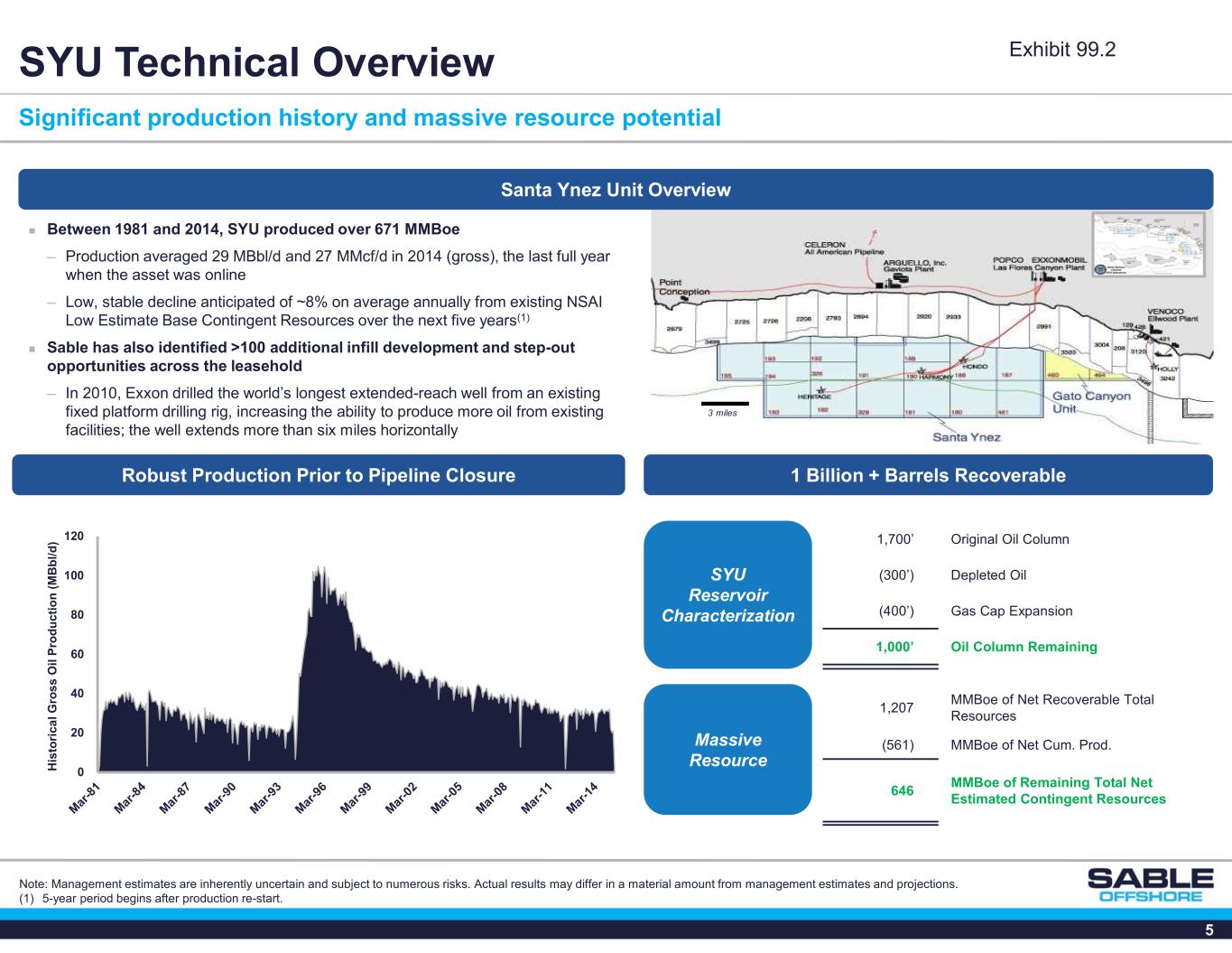 4 SYU History Premier offshore project developed by Exxon over 40+ years  Discovered in 1968, over the course of 14 years Exxon consolidated more than a dozen offshore federal oil leases into a streamlined production unit known as SYU ─ SYU construction began in 1976 with Platform Hondo, with first production in 1981, followed by Platform Harmony and Platform Heritage (both online in 1994); both Harmony and Heritage have dedicated rigs for future development. Production was initially processed in federal waters in an OS&T from 1981 to 1994. ─ SYU includes 112 wells (90 producers, 12 injectors, 10 idle); sizable inventory of infill drilling and additional step-out drilling opportunities(1) ─ Platforms located 5 to 9 miles offshore Santa Barbara County in shallow water depths of 900-1,200’(2) SYU Development Background  Wholly-owned onshore oil and natural gas processing facility at Las Flores Canyon (not visible from highway)  Shut in from June 2015 to May 2025 due to pipeline issue (Plains All- American Pipeline (“AAPL”) operated) ─ Production at all Exxon platforms and facilities was safely suspended. SYU was placed into a preserved state with regular inspections and maintenance ─ AAPL received Consent Decree and began work to resume petroleum transportation ─ Exxon acquired pipeline from AAPL  Sable restarted production at SYU Platform Harmony in May 2025 and began flowing production to Las Flores Canyon(3)  Sable is pursuing an OS&T as an offtake alternative to LFC (1) Sable management have identified >100 infill drilling and step-out opportunities. (2) Primary Reservoir: Miocene Monterey formation (Sour low-gravity oil (4-26 API); Secondary Reservoirs: Oligocene and Eocene oil/gas sandstone (Sweet high-gravity oil (35 API). (3) SYU-produced oil is being held in the Company’s storage tanks at LFC while Sable awaits regulatory approvals to resume petroleum transportation through the Las Flores Pipeline System as outlined in the Consent Decree. Alternatively, Sable contemplates installing Offshore Storage & Treating vessel to process oil and gas production. Exhibit 99.2