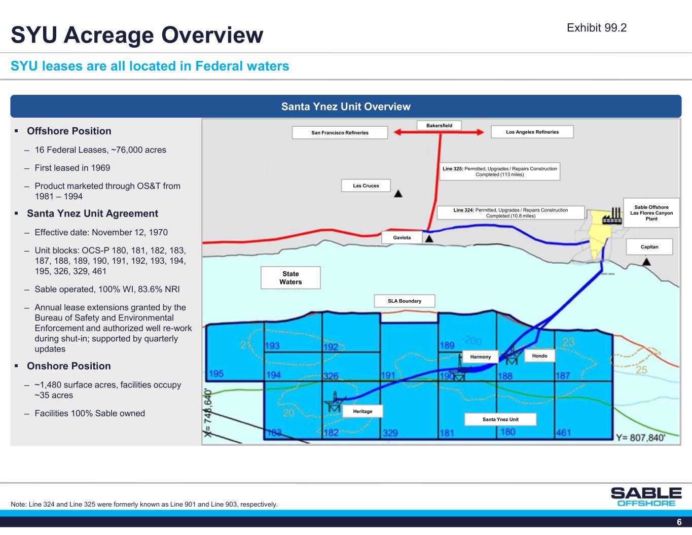 5 3 miles Santa Ynez Unit Overview SYU Technical Overview Significant production history and massive resource potential SYU Reservoir Characterization Massive Resource Original Oil Column1,700’ Depleted Oil(300’) Gas Cap Expansion(400’) Oil Column Remaining1,000’ MMBoe of Net Recoverable Total Resources 1,207 MMBoe of Net Cum. Prod.(561) MMBoe of Remaining Total Net Estimated Contingent Resources 646 Robust Production Prior to Pipeline Closure  Between 1981 and 2014, SYU produced over 671 MMBoe ─ Production averaged 29 MBbl/d and 27 MMcf/d in 2014 (gross), the last full year when the asset was online ─ Low, stable decline anticipated of ~8% on average annually from existing NSAI Low Estimate Base Contingent Resources over the next five years(1)  Sable has also identified >100 additional infill development and step-out opportunities across the leasehold ─ In 2010, Exxon drilled the world’s longest extended-reach well from an existing fixed platform drilling rig, increasing the ability to produce more oil from existing facilities; the well extends more than six miles horizontally 1 Billion + Barrels Recoverable 0 20 40 60 80 100 120 H is to ri c a l G ro s s O il P ro d u c ti o n ( M B b l/ d ) Note: Management estimates are inherently uncertain and subject to numerous risks. Actual results may differ in a material amount from management estimates and projections. (1) 5-year period begins after production re-start. Exhibit 99.2