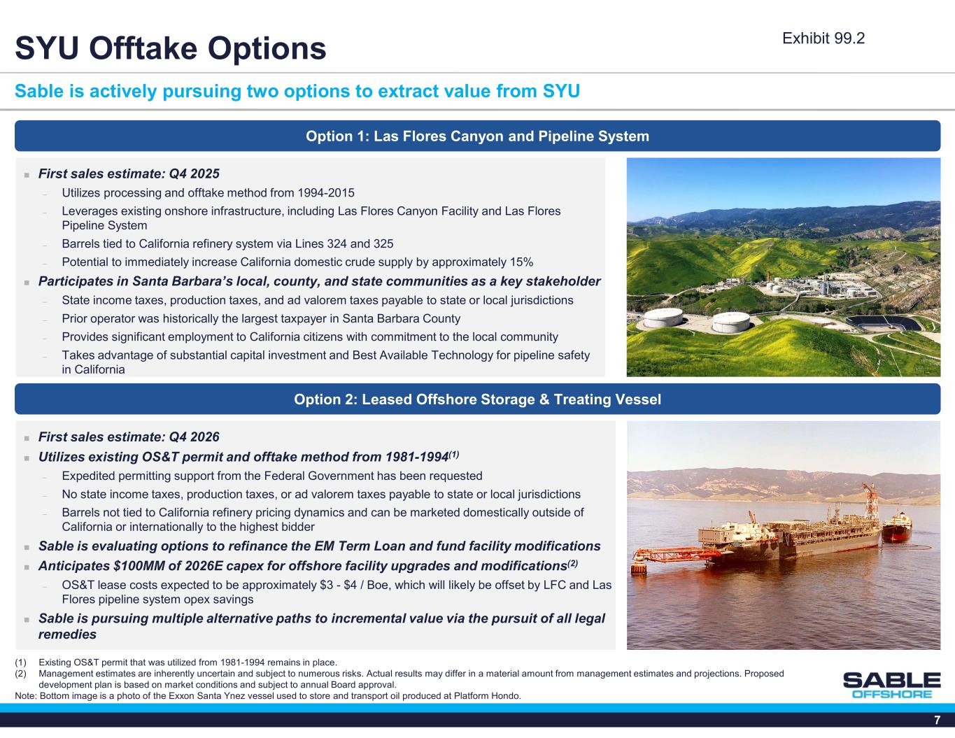 6 Note: Line 324 and Line 325 were formerly known as Line 901 and Line 903, respectively. Santa Ynez Unit Overview SYU Acreage Overview SYU leases are all located in Federal waters  Offshore Position ─ 16 Federal Leases, ~76,000 acres ─ First leased in 1969 ─ Product marketed through OS&T from 1981 – 1994  Santa Ynez Unit Agreement ─ Effective date: November 12, 1970 ─ Unit blocks: OCS-P 180, 181, 182, 183, 187, 188, 189, 190, 191, 192, 193, 194, 195, 326, 329, 461 ─ Sable operated, 100% WI, 83.6% NRI ─ Annual lease extensions granted by the Bureau of Safety and Environmental Enforcement and authorized well re-work during shut-in; supported by quarterly updates  Onshore Position ─ ~1,480 surface acres, facilities occupy ~35 acres ─ Facilities 100% Sable owned Line 325: Permitted, Upgrades / Repairs Construction Completed (113 miles) Capitan Sable Offshore Las Flores Canyon Plant Los Angeles Refineries Bakersfield San Francisco Refineries Las Cruces Gaviota SLA Boundary State Waters Harmony Hondo Santa Ynez Unit Heritage Line 324: Permitted, Upgrades / Repairs Construction Completed (10.8 miles) Exhibit 99.2