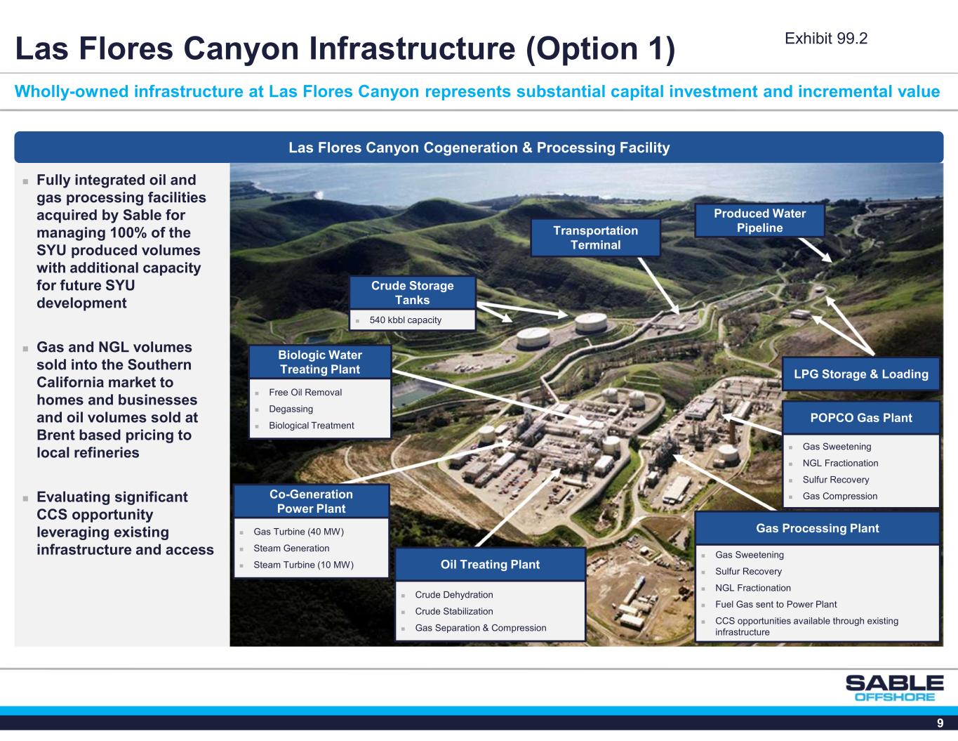 8 SYU Accelerates and Achieves California Supply Stabilization SYU production provides immediate supply increase into California refineries via Option 1 California Crude Oil Production Forecast (MMBbl/yr) Source: CalGEM presentation to the chairs of the Natural Resources, Transportation, and Utilities and Energy Committees of the California State Assembly on August 20, 2025. Note: CalGEM presentation replicated to best extent possible, values are estimates. 2026 – 2028 California onshore production is Sable’s internally estimated California onshore production based on operator commentary in public disclosures and sell-side equity research analysis. SB-237 Effective – 1/1/26 125 MMBbl/yr Target Commentary • California outlines a ~57,000 barrel of oil per day increase in production necessary to satisfy state production targets • Only Sable’s SYU and onshore assets provide immediate access to available oil reserves without the major capital investment necessary for new onshore production • Sable’s SYU production can lower gasoline prices for California citizens +23 MM Bbls/Year from SYU Exhibit 99.2
