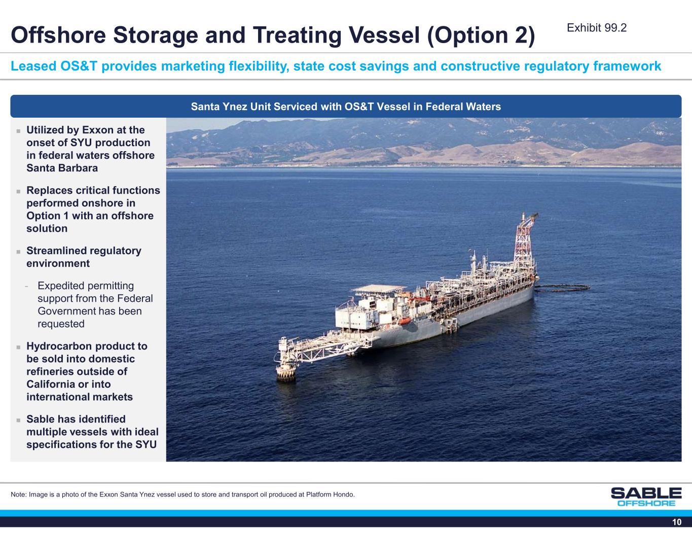 9 Las Flores Canyon Cogeneration & Processing Facility Las Flores Canyon Infrastructure (Option 1) Wholly-owned infrastructure at Las Flores Canyon represents substantial capital investment and incremental value  Fully integrated oil and gas processing facilities acquired by Sable for managing 100% of the SYU produced volumes with additional capacity for future SYU development  Gas and NGL volumes sold into the Southern California market to homes and businesses and oil volumes sold at Brent based pricing to local refineries  Evaluating significant CCS opportunity leveraging existing infrastructure and access Crude Storage Tanks Transportation Terminal Produced Water Pipeline Oil Treating Plant Co-Generation Power Plant Biologic Water Treating Plant  Crude Dehydration  Crude Stabilization  Gas Separation & Compression  Free Oil Removal  Degassing  Biological Treatment  540 kbbl capacity  Gas Turbine (40 MW)  Steam Generation  Steam Turbine (10 MW) LPG Storage & Loading POPCO Gas Plant  Gas Sweetening  NGL Fractionation  Sulfur Recovery  Gas Compression Gas Processing Plant  Gas Sweetening  Sulfur Recovery  NGL Fractionation  Fuel Gas sent to Power Plant  CCS opportunities available through existing infrastructure Exhibit 99.2