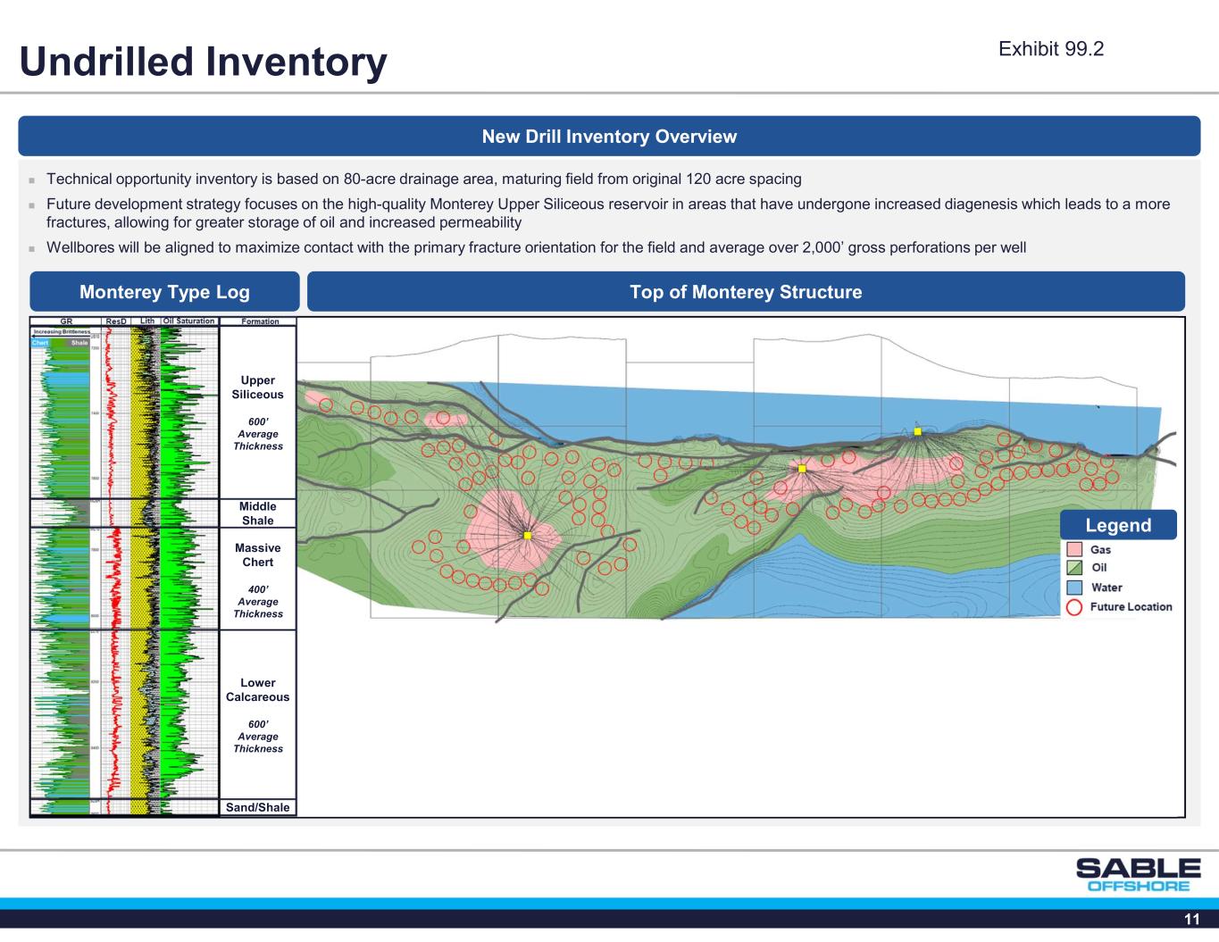 10 Santa Ynez Unit Serviced with OS&T Vessel in Federal Waters Offshore Storage and Treating Vessel (Option 2) Leased OS&T provides marketing flexibility, state cost savings and constructive regulatory framework  Utilized by Exxon at the onset of SYU production in federal waters offshore Santa Barbara  Replaces critical functions performed onshore in Option 1 with an offshore solution  Streamlined regulatory environment - Expedited permitting support from the Federal Government has been requested  Hydrocarbon product to be sold into domestic refineries outside of California or into international markets  Sable has identified multiple vessels with ideal specifications for the SYU Note: Image is a photo of the Exxon Santa Ynez vessel used to store and transport oil produced at Platform Hondo. Exhibit 99.2