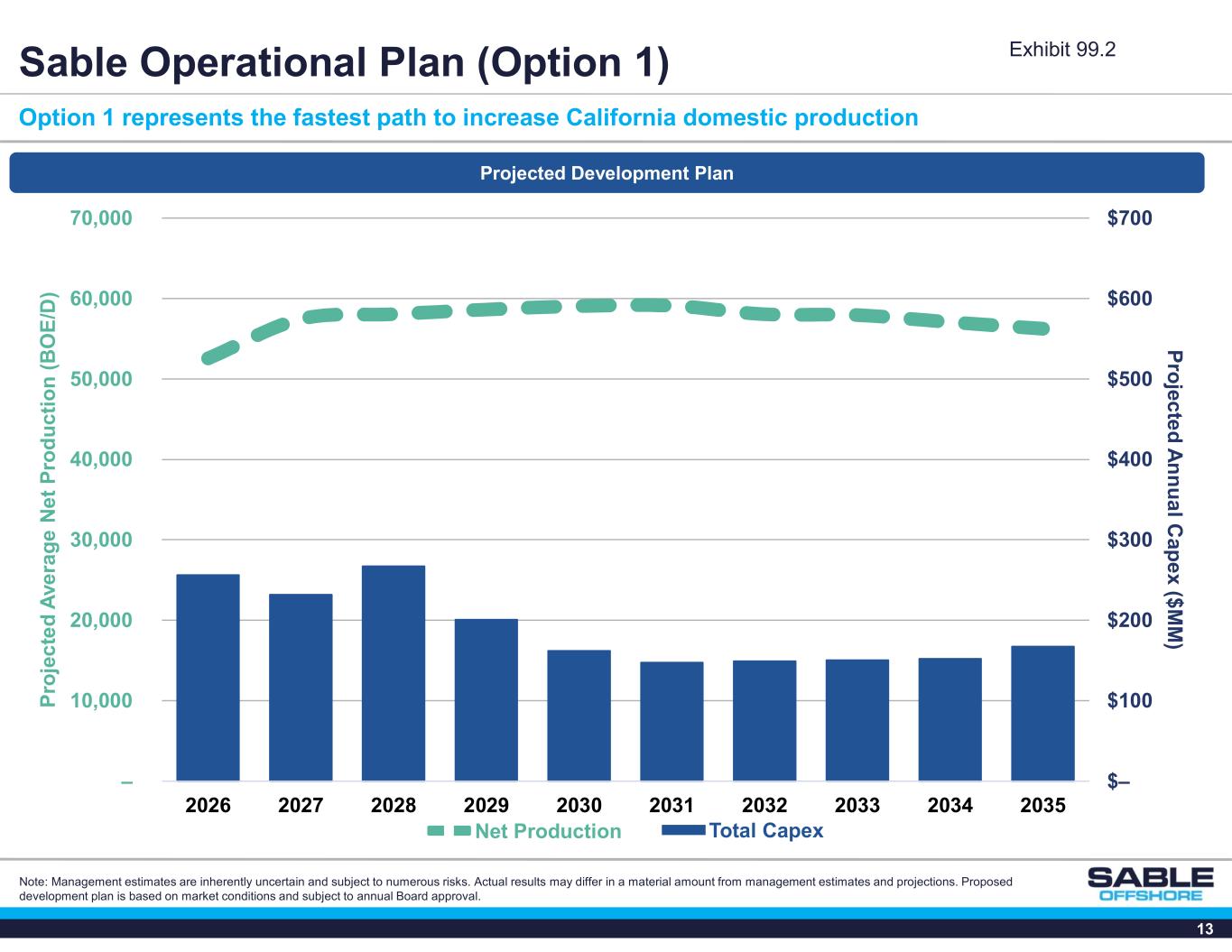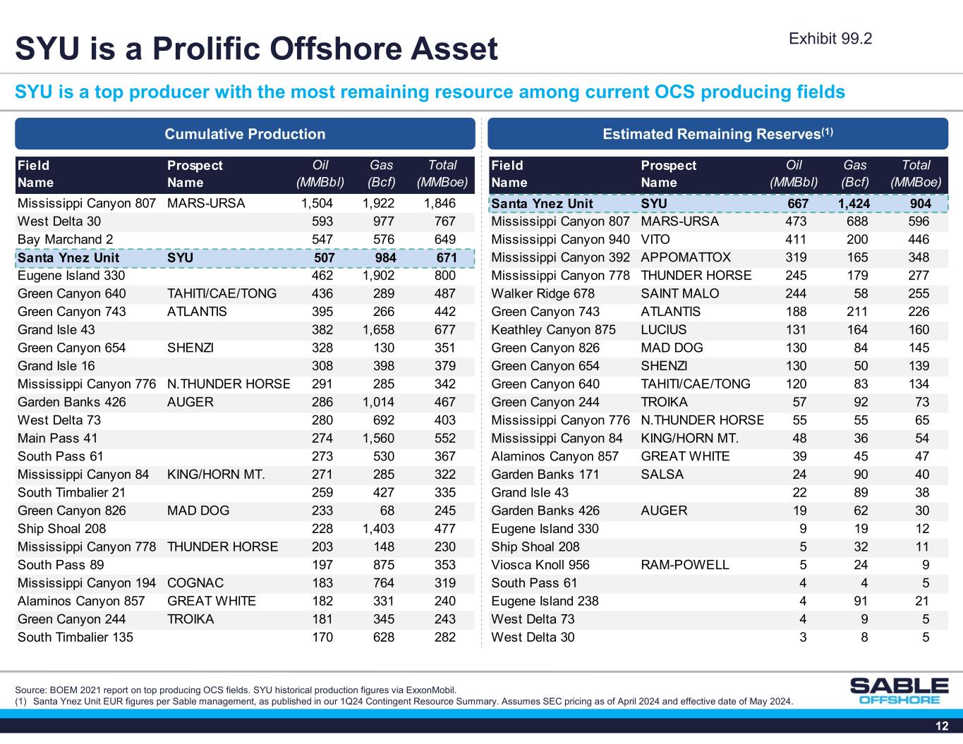 12 Field Name Prospect Name Oil (MMBbl) Gas (Bcf) Total (MMBoe) Santa Ynez Unit SYU 667 1,424 904 Mississippi Canyon 807 MARS-URSA 473 688 596 Mississippi Canyon 940 VITO 411 200 446 Mississippi Canyon 392 APPOMATTOX 319 165 348 Mississippi Canyon 778 THUNDER HORSE 245 179 277 Walker Ridge 678 SAINT MALO 244 58 255 Green Canyon 743 ATLANTIS 188 211 226 Keathley Canyon 875 LUCIUS 131 164 160 Green Canyon 826 MAD DOG 130 84 145 Green Canyon 654 SHENZI 130 50 139 Green Canyon 640 TAHITI/CAE/TONG 120 83 134 Green Canyon 244 TROIKA 57 92 73 Mississippi Canyon 776 N.THUNDER HORSE 55 55 65 Mississippi Canyon 84 KING/HORN MT. 48 36 54 Alaminos Canyon 857 GREAT WHITE 39 45 47 Garden Banks 171 SALSA 24 90 40 Grand Isle 43 22 89 38 Garden Banks 426 AUGER 19 62 30 Eugene Island 330 9 19 12 Ship Shoal 208 5 32 11 Viosca Knoll 956 RAM-POWELL 5 24 9 South Pass 61 4 4 5 Eugene Island 238 4 91 21 West Delta 73 4 9 5 West Delta 30 3 8 5 SYU is a Prolific Offshore Asset Cumulative Production Source: BOEM 2021 report on top producing OCS fields. SYU historical production figures via ExxonMobil. (1) Santa Ynez Unit EUR figures per Sable management, as published in our 1Q24 Contingent Resource Summary. Assumes SEC pricing as of April 2024 and effective date of May 2024. Estimated Remaining Reserves(1) SYU is a top producer with the most remaining resource among current OCS producing fields Field Name Prospect Name Oil (MMBbl) Gas (Bcf) Total (MMBoe) Mississippi Canyon 807 MARS-URSA 1,504 1,922 1,846 West Delta 30 593 977 767 Bay Marchand 2 547 576 649 Santa Ynez Unit SYU 507 984 671 Eugene Island 330 462 1,902 800 Green Canyon 640 TAHITI/CAE/TONG 436 289 487 Green Canyon 743 ATLANTIS 395 266 442 Grand Isle 43 382 1,658 677 Green Canyon 654 SHENZI 328 130 351 Grand Isle 16 308 398 379 Mississippi Canyon 776 N.THUNDER HORSE 291 285 342 Garden Banks 426 AUGER 286 1,014 467 West Delta 73 280 692 403 Main Pass 41 274 1,560 552 South Pass 61 273 530 367 Mississippi Canyon 84 KING/HORN MT. 271 285 322 South Timbalier 21 259 427 335 Green Canyon 826 MAD DOG 233 68 245 Ship Shoal 208 228 1,403 477 Mississippi Canyon 778 THUNDER HORSE 203 148 230 South Pass 89 197 875 353 Mississippi Canyon 194 COGNAC 183 764 319 Alaminos Canyon 857 GREAT WHITE 182 331 240 Green Canyon 244 TROIKA 181 345 243 South Timbalier 135 170 628 282 Exhibit 99.2