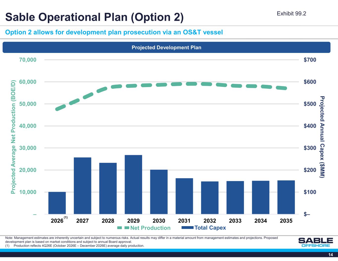 13 Sable Operational Plan (Option 1) Option 1 represents the fastest path to increase California domestic production Note: Management estimates are inherently uncertain and subject to numerous risks. Actual results may differ in a material amount from management estimates and projections. Proposed development plan is based on market conditions and subject to annual Board approval. $– $100 $200 $300 $400 $500 $600 $700 – 10,000 20,000 30,000 40,000 50,000 60,000 70,000 2026 2027 2028 2029 2030 2031 2032 2033 2034 2035 P ro jec te d A n n u a l C ap e x ($ M M ) P ro je c te d A ve ra g e N e t P ro d u c ti o n ( B O E /D ) Net Production Total Capex Projected Development Plan Exhibit 99.2