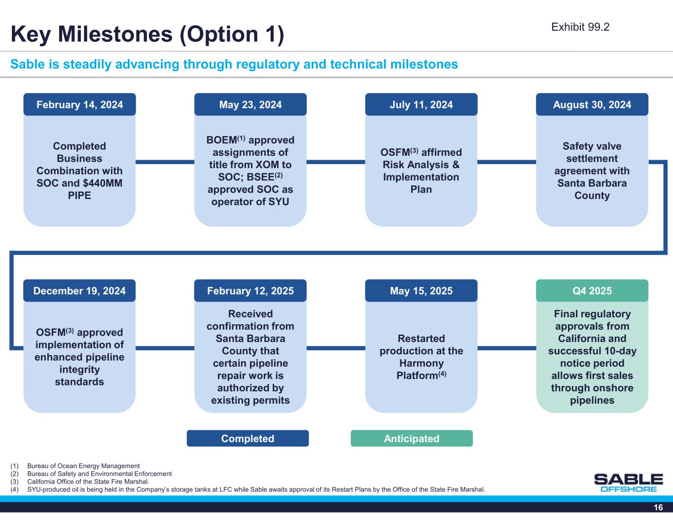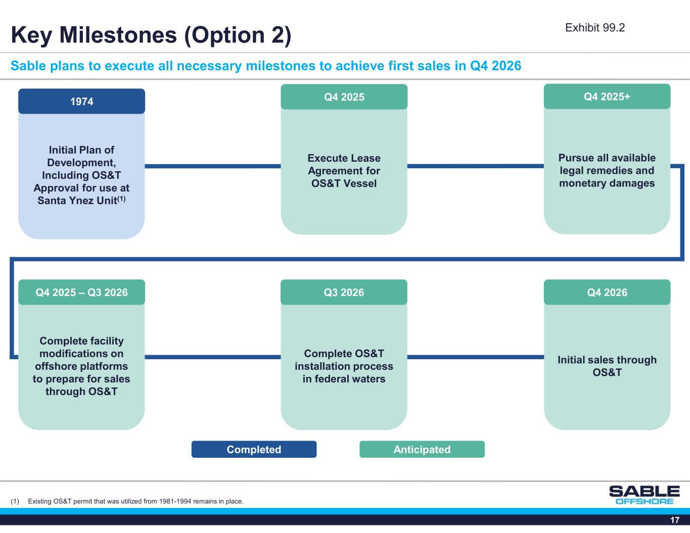16 Key Milestones (Option 1) Sable is steadily advancing through regulatory and technical milestones Completed Business Combination with SOC and $440MM PIPE February 14, 2024 BOEM(1) approved assignments of title from XOM to SOC; BSEE(2) approved SOC as operator of SYU May 23, 2024 Safety valve settlement agreement with Santa Barbara County August 30, 2024 OSFM(3) approved implementation of enhanced pipeline integrity standards December 19, 2024 Completed Anticipated OSFM(3) affirmed Risk Analysis & Implementation Plan July 11, 2024 Received confirmation from Santa Barbara County that certain pipeline repair work is authorized by existing permits February 12, 2025 Final regulatory approvals from California and successful 10-day notice period allows first sales through onshore pipelines Q4 2025 Restarted production at the Harmony Platform(4) May 15, 2025 (1) Bureau of Ocean Energy Management (2) Bureau of Safety and Environmental Enforcement (3) California Office of the State Fire Marshal. (4) SYU-produced oil is being held in the Company’s storage tanks at LFC while Sable awaits approval of its Restart Plans by the Office of the State Fire Marshal. Exhibit 99.2