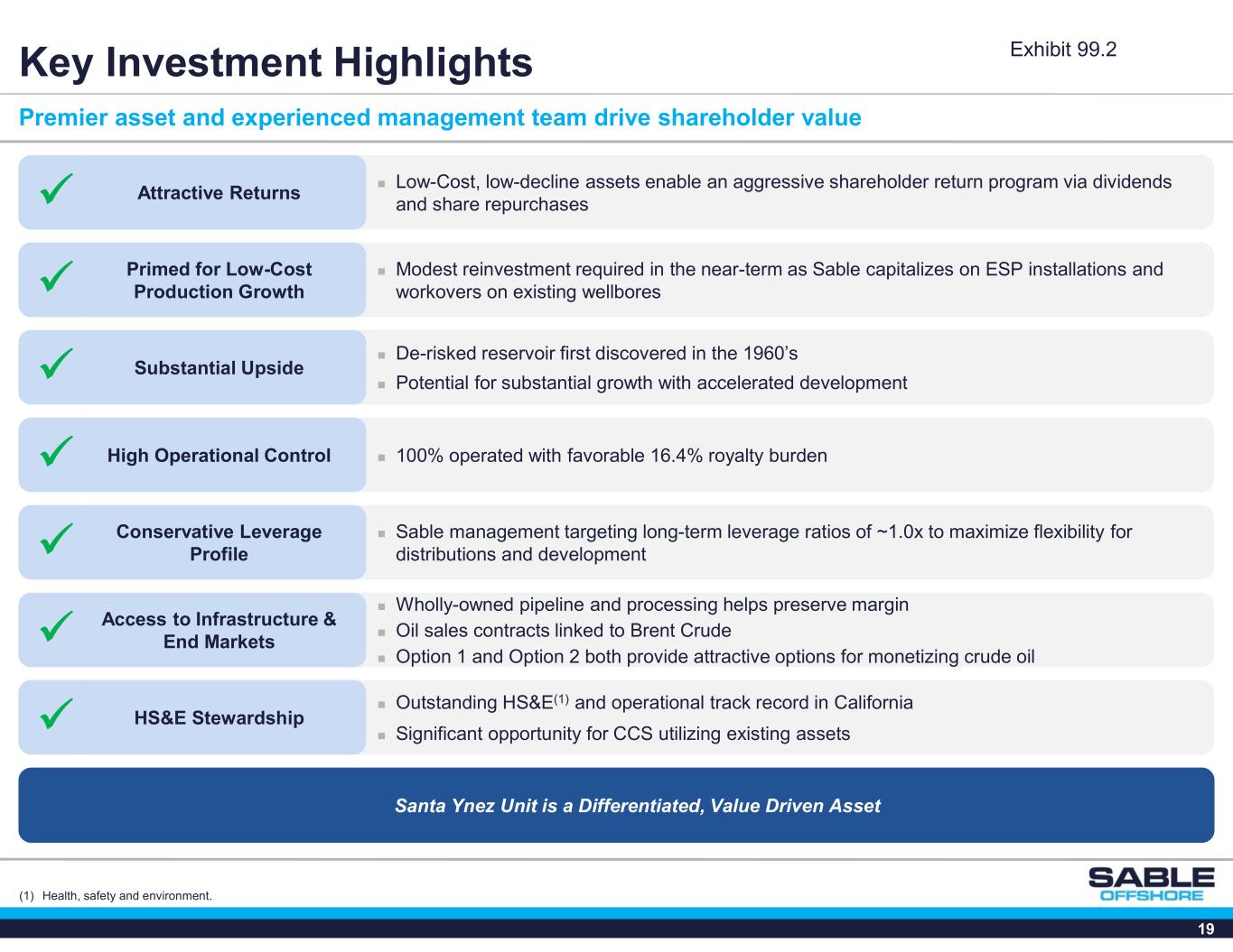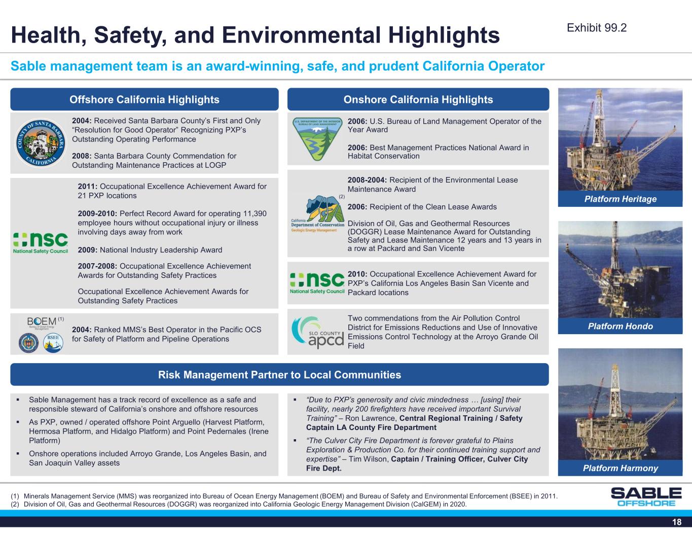18 Sable management team is an award-winning, safe, and prudent California Operator Two commendations from the Air Pollution Control District for Emissions Reductions and Use of Innovative Emissions Control Technology at the Arroyo Grande Oil Field  “Due to PXP’s generosity and civic mindedness … [using] their facility, nearly 200 firefighters have received important Survival Training” – Ron Lawrence, Central Regional Training / Safety Captain LA County Fire Department  “The Culver City Fire Department is forever grateful to Plains Exploration & Production Co. for their continued training support and expertise” – Tim Wilson, Captain / Training Officer, Culver City Fire Dept. Health, Safety, and Environmental Highlights Risk Management Partner to Local Communities Offshore California Highlights  Sable Management has a track record of excellence as a safe and responsible steward of California’s onshore and offshore resources  As PXP, owned / operated offshore Point Arguello (Harvest Platform, Hermosa Platform, and Hidalgo Platform) and Point Pedernales (Irene Platform)  Onshore operations included Arroyo Grande, Los Angeles Basin, and San Joaquin Valley assets 2011: Occupational Excellence Achievement Award for 21 PXP locations 2009-2010: Perfect Record Award for operating 11,390 employee hours without occupational injury or illness involving days away from work 2009: National Industry Leadership Award 2007-2008: Occupational Excellence Achievement Awards for Outstanding Safety Practices Occupational Excellence Achievement Awards for Outstanding Safety Practices 2008-2004: Recipient of the Environmental Lease Maintenance Award 2006: Recipient of the Clean Lease Awards Division of Oil, Gas and Geothermal Resources (DOGGR) Lease Maintenance Award for Outstanding Safety and Lease Maintenance 12 years and 13 years in a row at Packard and San Vicente 2004: Received Santa Barbara County’s First and Only “Resolution for Good Operator” Recognizing PXP’s Outstanding Operating Performance 2008: Santa Barbara County Commendation for Outstanding Maintenance Practices at LOGP 2004: Ranked MMS’s Best Operator in the Pacific OCS for Safety of Platform and Pipeline Operations Onshore California Highlights 2010: Occupational Excellence Achievement Award for PXP’s California Los Angeles Basin San Vicente and Packard locations 2006: U.S. Bureau of Land Management Operator of the Year Award 2006: Best Management Practices National Award in Habitat Conservation (2) (1) (1) Minerals Management Service (MMS) was reorganized into Bureau of Ocean Energy Management (BOEM) and Bureau of Safety and Environmental Enforcement (BSEE) in 2011. (2) Division of Oil, Gas and Geothermal Resources (DOGGR) was reorganized into California Geologic Energy Management Division (CalGEM) in 2020. Platform Hondo Platform Harmony Platform Heritage Exhibit 99.2
