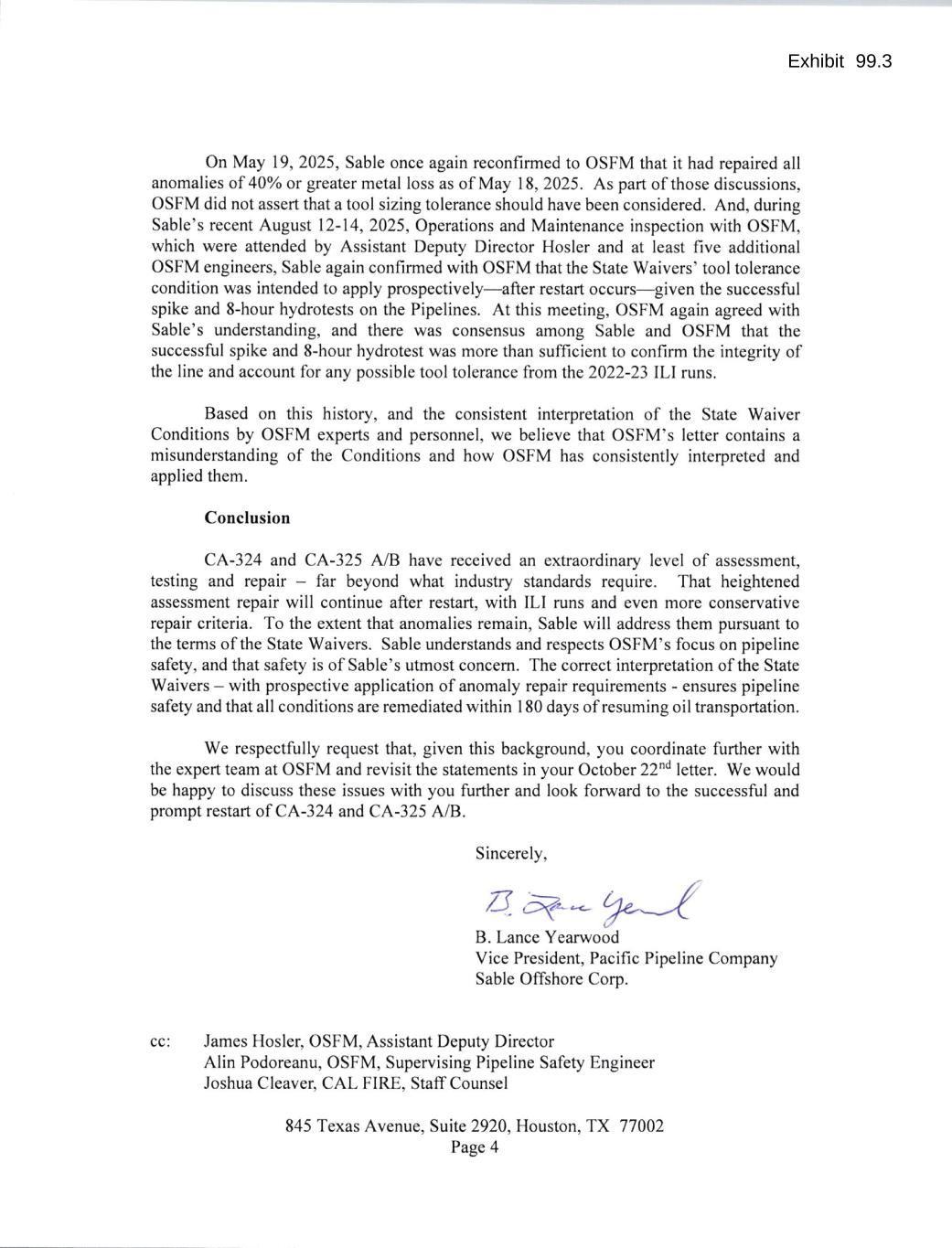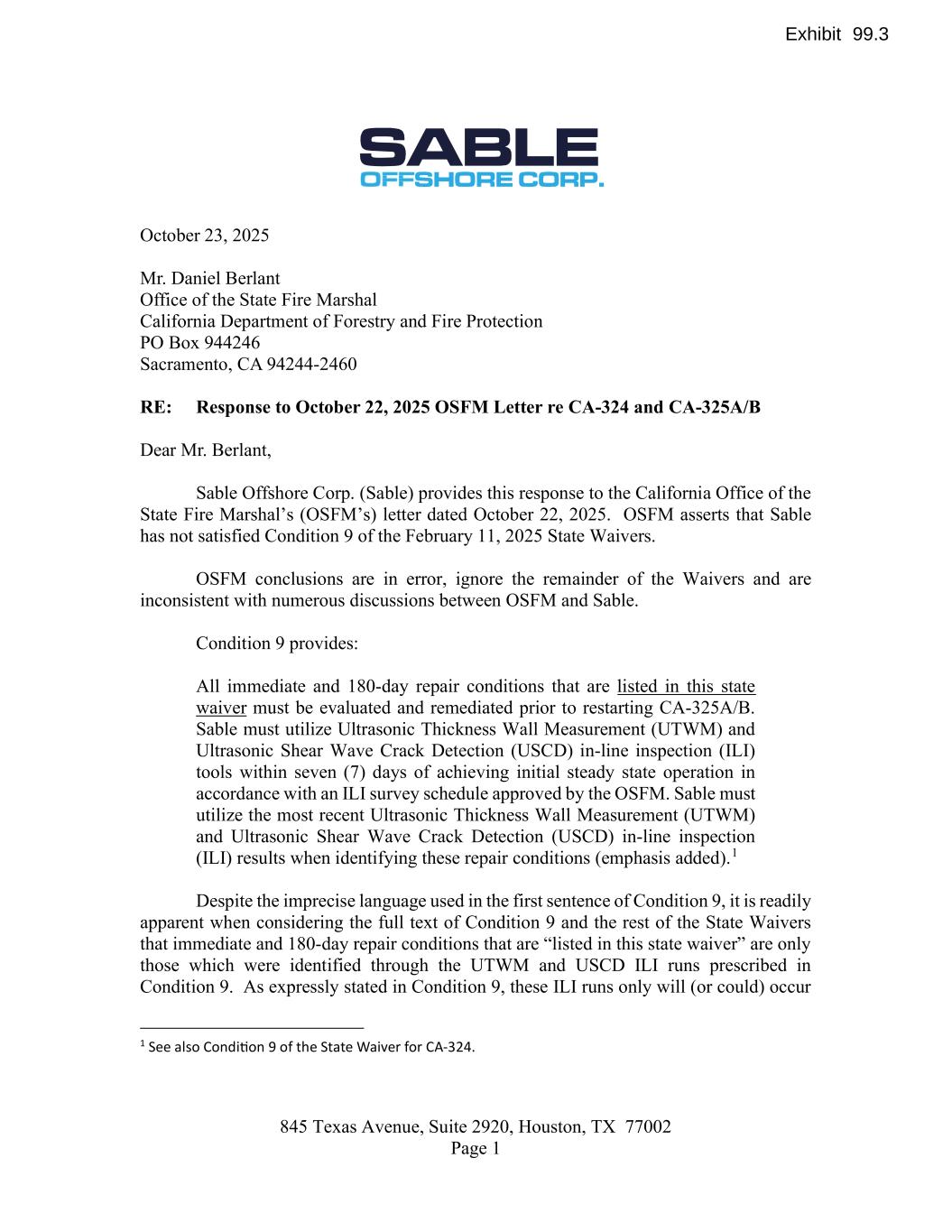 845 Texas Avenue, Suite 2920, Houston, TX 77002 Page 1 October 23, 2025 Mr. Daniel Berlant Office of the State Fire Marshal California Department of Forestry and Fire Protection PO Box 944246 Sacramento, CA 94244-2460 RE: Response to October 22, 2025 OSFM Letter re CA-324 and CA-325A/B Dear Mr. Berlant, Sable Offshore Corp. (Sable) provides this response to the California Office of the State Fire Marshal’s (OSFM’s) letter dated October 22, 2025. OSFM asserts that Sable has not satisfied Condition 9 of the February 11, 2025 State Waivers. OSFM conclusions are in error, ignore the remainder of the Waivers and are inconsistent with numerous discussions between OSFM and Sable. Condition 9 provides: All immediate and 180-day repair conditions that are listed in this state waiver must be evaluated and remediated prior to restarting CA-325A/B. Sable must utilize Ultrasonic Thickness Wall Measurement (UTWM) and Ultrasonic Shear Wave Crack Detection (USCD) in-line inspection (ILI) tools within seven (7) days of achieving initial steady state operation in accordance with an ILI survey schedule approved by the OSFM. Sable must utilize the most recent Ultrasonic Thickness Wall Measurement (UTWM) and Ultrasonic Shear Wave Crack Detection (USCD) in-line inspection (ILI) results when identifying these repair conditions (emphasis added).1 Despite the imprecise language used in the first sentence of Condition 9, it is readily apparent when considering the full text of Condition 9 and the rest of the State Waivers that immediate and 180-day repair conditions that are “listed in this state waiver” are only those which were identified through the UTWM and USCD ILI runs prescribed in Condition 9. As expressly stated in Condition 9, these ILI runs only will (or could) occur 1 See also CondiƟon 9 of the State Waiver for CA-324.