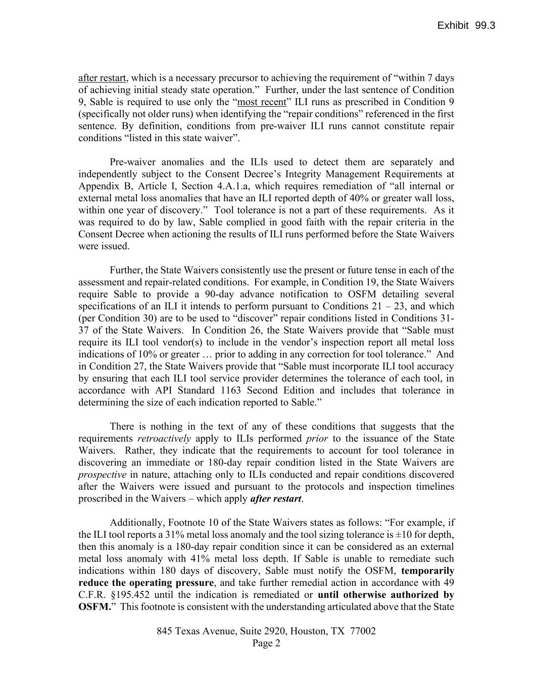 845 Texas Avenue, Suite 2920, Houston, TX 77002 Page 2 after restart, which is a necessary precursor to achieving the requirement of “within 7 days of achieving initial steady state operation.” Further, under the last sentence of Condition 9, Sable is required to use only the “most recent” ILI runs as prescribed in Condition 9 (specifically not older runs) when identifying the “repair conditions” referenced in the first sentence. By definition, conditions from pre-waiver ILI runs cannot constitute repair conditions “listed in this state waiver”. Pre-waiver anomalies and the ILIs used to detect them are separately and independently subject to the Consent Decree’s Integrity Management Requirements at Appendix B, Article I, Section 4.A.1.a, which requires remediation of “all internal or external metal loss anomalies that have an ILI reported depth of 40% or greater wall loss, within one year of discovery.” Tool tolerance is not a part of these requirements. As it was required to do by law, Sable complied in good faith with the repair criteria in the Consent Decree when actioning the results of ILI runs performed before the State Waivers were issued. Further, the State Waivers consistently use the present or future tense in each of the assessment and repair-related conditions. For example, in Condition 19, the State Waivers require Sable to provide a 90-day advance notification to OSFM detailing several specifications of an ILI it intends to perform pursuant to Conditions 21 – 23, and which (per Condition 30) are to be used to “discover” repair conditions listed in Conditions 31- 37 of the State Waivers. In Condition 26, the State Waivers provide that “Sable must require its ILI tool vendor(s) to include in the vendor’s inspection report all metal loss indications of 10% or greater … prior to adding in any correction for tool tolerance.” And in Condition 27, the State Waivers provide that “Sable must incorporate ILI tool accuracy by ensuring that each ILI tool service provider determines the tolerance of each tool, in accordance with API Standard 1163 Second Edition and includes that tolerance in determining the size of each indication reported to Sable.” There is nothing in the text of any of these conditions that suggests that the requirements retroactively apply to ILIs performed prior to the issuance of the State Waivers. Rather, they indicate that the requirements to account for tool tolerance in discovering an immediate or 180-day repair condition listed in the State Waivers are prospective in nature, attaching only to ILIs conducted and repair conditions discovered after the Waivers were issued and pursuant to the protocols and inspection timelines proscribed in the Waivers – which apply after restart. Additionally, Footnote 10 of the State Waivers states as follows: “For example, if the ILI tool reports a 31% metal loss anomaly and the tool sizing tolerance is ±10 for depth, then this anomaly is a 180-day repair condition since it can be considered as an external metal loss anomaly with 41% metal loss depth. If Sable is unable to remediate such indications within 180 days of discovery, Sable must notify the OSFM, temporarily reduce the operating pressure, and take further remedial action in accordance with 49 C.F.R. §195.452 until the indication is remediated or until otherwise authorized by OSFM.” This footnote is consistent with the understanding articulated above that the State