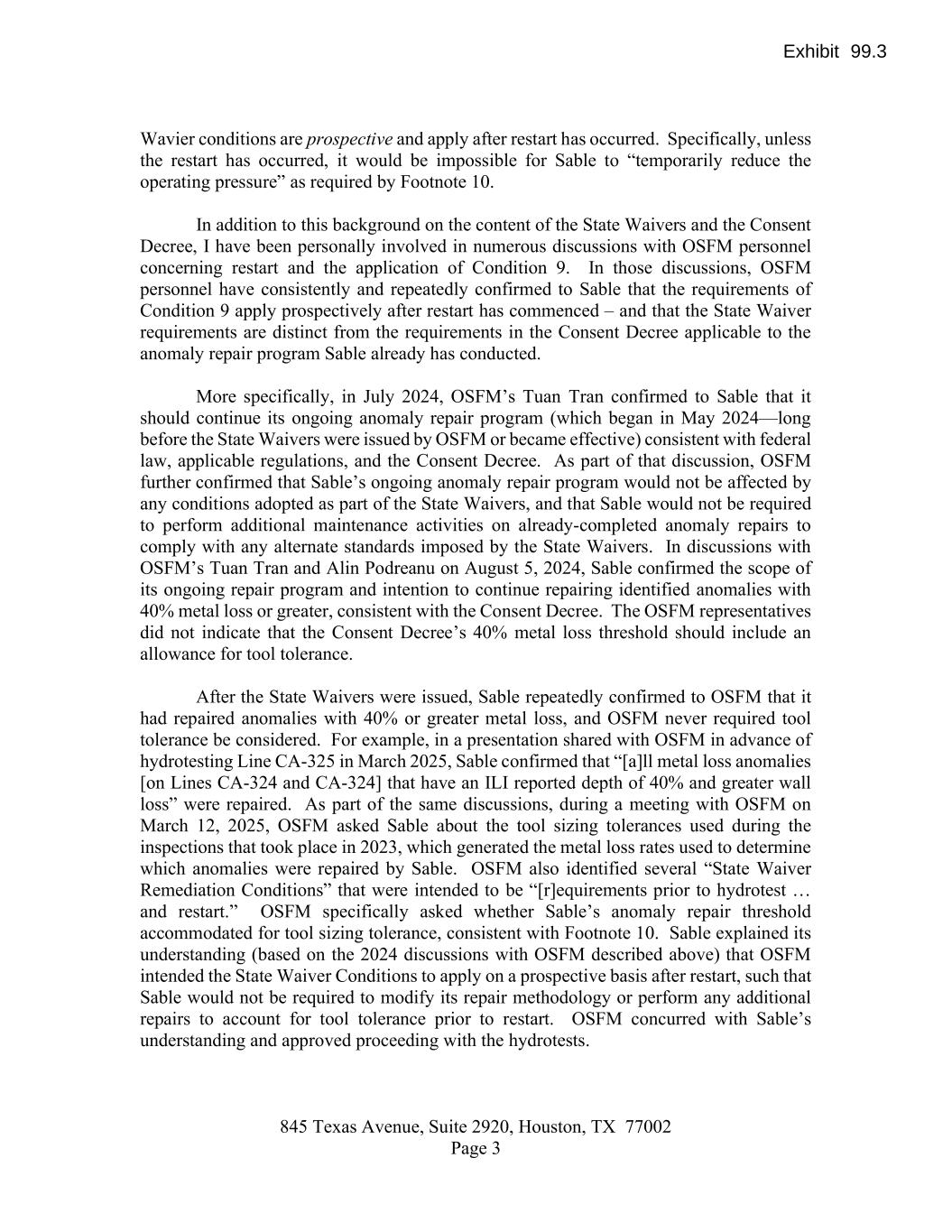 845 Texas Avenue, Suite 2920, Houston, TX 77002 Page 3 Wavier conditions are prospective and apply after restart has occurred. Specifically, unless the restart has occurred, it would be impossible for Sable to “temporarily reduce the operating pressure” as required by Footnote 10. In addition to this background on the content of the State Waivers and the Consent Decree, I have been personally involved in numerous discussions with OSFM personnel concerning restart and the application of Condition 9. In those discussions, OSFM personnel have consistently and repeatedly confirmed to Sable that the requirements of Condition 9 apply prospectively after restart has commenced – and that the State Waiver requirements are distinct from the requirements in the Consent Decree applicable to the anomaly repair program Sable already has conducted. More specifically, in July 2024, OSFM’s Tuan Tran confirmed to Sable that it should continue its ongoing anomaly repair program (which began in May 2024—long before the State Waivers were issued by OSFM or became effective) consistent with federal law, applicable regulations, and the Consent Decree. As part of that discussion, OSFM further confirmed that Sable’s ongoing anomaly repair program would not be affected by any conditions adopted as part of the State Waivers, and that Sable would not be required to perform additional maintenance activities on already-completed anomaly repairs to comply with any alternate standards imposed by the State Waivers. In discussions with OSFM’s Tuan Tran and Alin Podreanu on August 5, 2024, Sable confirmed the scope of its ongoing repair program and intention to continue repairing identified anomalies with 40% metal loss or greater, consistent with the Consent Decree. The OSFM representatives did not indicate that the Consent Decree’s 40% metal loss threshold should include an allowance for tool tolerance. After the State Waivers were issued, Sable repeatedly confirmed to OSFM that it had repaired anomalies with 40% or greater metal loss, and OSFM never required tool tolerance be considered. For example, in a presentation shared with OSFM in advance of hydrotesting Line CA-325 in March 2025, Sable confirmed that “[a]ll metal loss anomalies [on Lines CA-324 and CA-324] that have an ILI reported depth of 40% and greater wall loss” were repaired. As part of the same discussions, during a meeting with OSFM on March 12, 2025, OSFM asked Sable about the tool sizing tolerances used during the inspections that took place in 2023, which generated the metal loss rates used to determine which anomalies were repaired by Sable. OSFM also identified several “State Waiver Remediation Conditions” that were intended to be “[r]equirements prior to hydrotest … and restart.” OSFM specifically asked whether Sable’s anomaly repair threshold accommodated for tool sizing tolerance, consistent with Footnote 10. Sable explained its understanding (based on the 2024 discussions with OSFM described above) that OSFM intended the State Waiver Conditions to apply on a prospective basis after restart, such that Sable would not be required to modify its repair methodology or perform any additional repairs to account for tool tolerance prior to restart. OSFM concurred with Sable’s understanding and approved proceeding with the hydrotests.