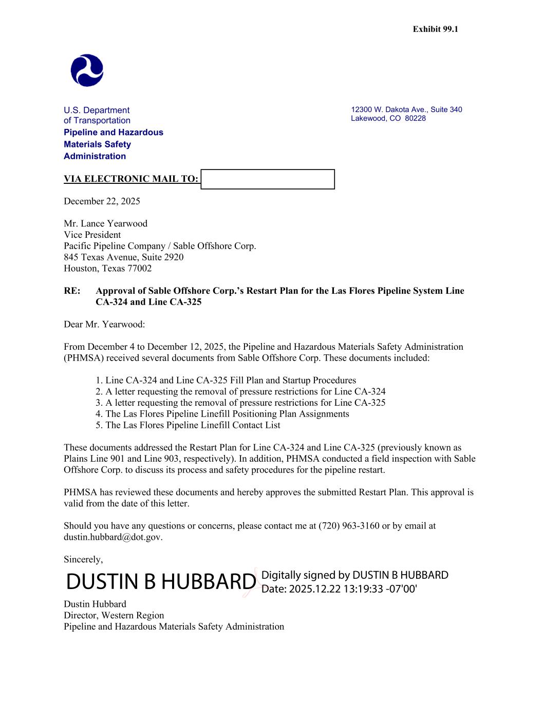 U.S. Department of Transportation Pipeline and Hazardous Materials Safety Administration VIA ELECTRONIC MAIL TO: lyearwood@sableoffshore.com December 22, 2025 Mr. Lance Yearwood Vice President Pacific Pipeline Company / Sable Offshore Corp. 845 Texas Avenue, Suite 2920 Houston, Texas 77002 RE: Approval of Sable Offshore Corp.’s Restart Plan for the Las Flores Pipeline System Line CA-324 and Line CA-325 Dear Mr. Yearwood: From December 4 to December 12, 2025, the Pipeline and Hazardous Materials Safety Administration (PHMSA) received several documents from Sable Offshore Corp. These documents included: 1. Line CA-324 and Line CA-325 Fill Plan and Startup Procedures 2. A letter requesting the removal of pressure restrictions for Line CA-324 3. A letter requesting the removal of pressure restrictions for Line CA-325 4. The Las Flores Pipeline Linefill Positioning Plan Assignments 5. The Las Flores Pipeline Linefill Contact List These documents addressed the Restart Plan for Line CA-324 and Line CA-325 (previously known as Plains Line 901 and Line 903, respectively). In addition, PHMSA conducted a field inspection with Sable Offshore Corp. to discuss its process and safety procedures for the pipeline restart. PHMSA has reviewed these documents and hereby approves the submitted Restart Plan. This approval is valid from the date of this letter. Should you have any questions or concerns, please contact me at (720) 963-3160 or by email at dustin.hubbard@dot.gov. Sincerely, Dustin Hubbard Director, Western Region Pipeline and Hazardous Materials Safety Administration 12300 W. Dakota Ave., Suite 340 Lakewood, CO 80228 DUSTIN B HUBBARD Digitally signed by DUSTIN B HUBBARD Date: 2025.12.22 13:19:33 -07'00'