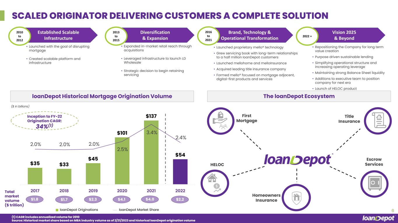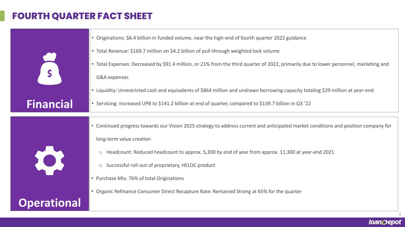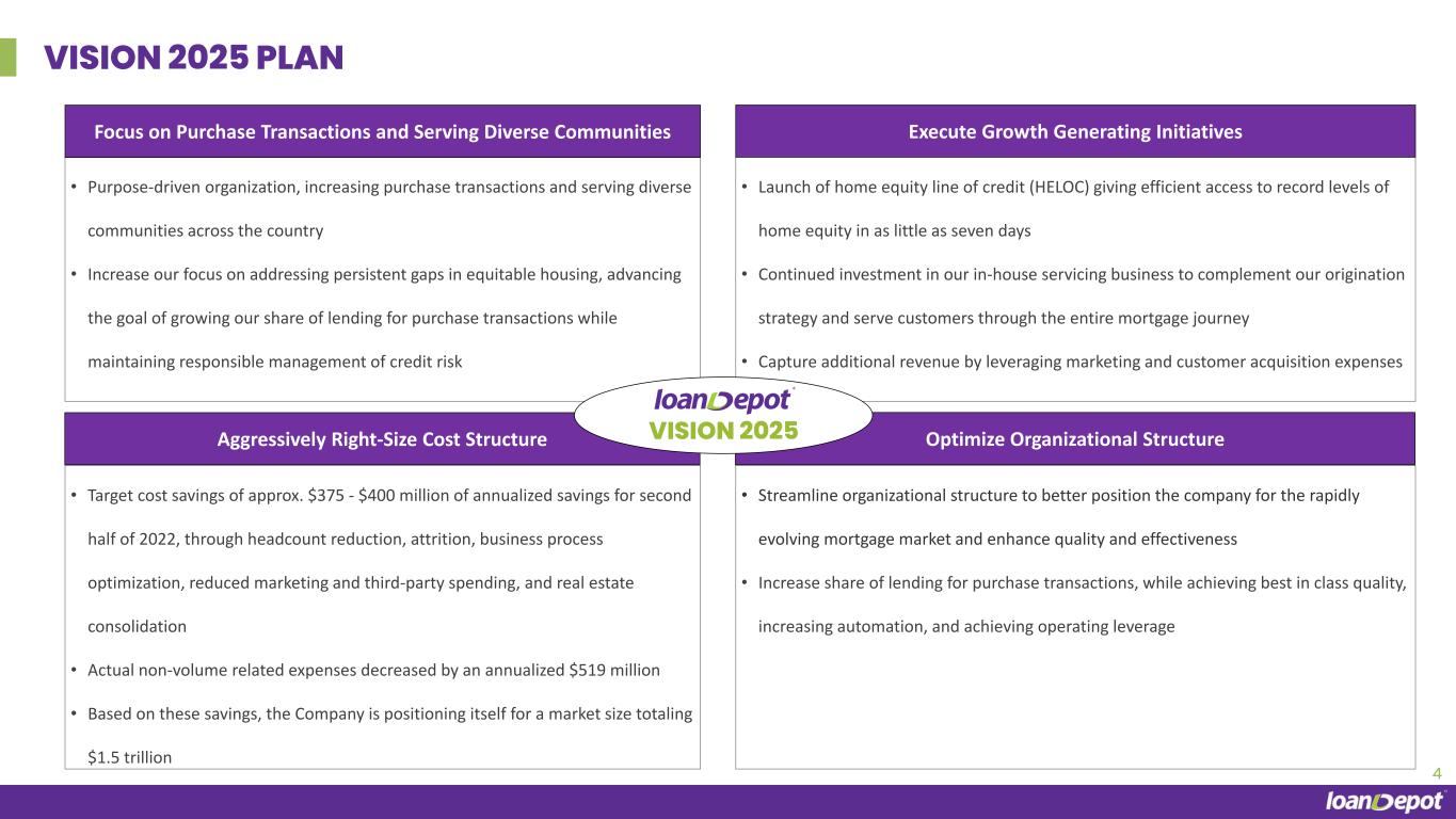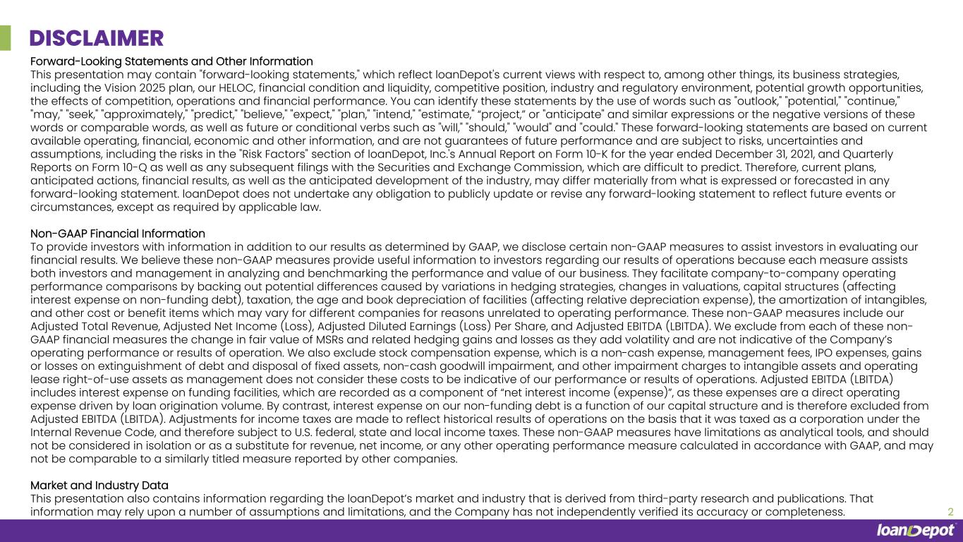 DISCLAIMER 2 Forward-Looking Statements and Other Information This presentation may contain "forward-looking statements," which reflect loanDepot's current views with respect to, among other things, its business strategies, including the Vision 2025 plan, our HELOC, financial condition and liquidity, competitive position, industry and regulatory environment, potential growth opportunities, the effects of competition, operations and financial performance. You can identify these statements by the use of words such as "outlook," "potential," "continue," "may," "seek," "approximately," "predict," "believe," "expect," "plan," "intend," "estimate," “project,” or "anticipate" and similar expressions or the negative versions of these words or comparable words, as well as future or conditional verbs such as "will," "should," "would" and "could." These forward-looking statements are based on current available operating, financial, economic and other information, and are not guarantees of future performance and are subject to risks, uncertainties and assumptions, including the risks in the "Risk Factors" section of loanDepot, Inc.'s Annual Report on Form 10-K for the year ended December 31, 2021, and Quarterly Reports on Form 10-Q as well as any subsequent filings with the Securities and Exchange Commission, which are difficult to predict. Therefore, current plans, anticipated actions, financial results, as well as the anticipated development of the industry, may differ materially from what is expressed or forecasted in any forward-looking statement. loanDepot does not undertake any obligation to publicly update or revise any forward-looking statement to reflect future events or circumstances, except as required by applicable law. Non-GAAP Financial Information To provide investors with information in addition to our results as determined by GAAP, we disclose certain non-GAAP measures to assist investors in evaluating our financial results. We believe these non-GAAP measures provide useful information to investors regarding our results of operations because each measure assists both investors and management in analyzing and benchmarking the performance and value of our business. They facilitate company-to-company operating performance comparisons by backing out potential differences caused by variations in hedging strategies, changes in valuations, capital structures (affecting interest expense on non-funding debt), taxation, the age and book depreciation of facilities (affecting relative depreciation expense), the amortization of intangibles, and other cost or benefit items which may vary for different companies for reasons unrelated to operating performance. These non-GAAP measures include our Adjusted Total Revenue, Adjusted Net Income (Loss), Adjusted Diluted Earnings (Loss) Per Share, and Adjusted EBITDA (LBITDA). We exclude from each of these non- GAAP financial measures the change in fair value of MSRs and related hedging gains and losses as they add volatility and are not indicative of the Company’s operating performance or results of operation. We also exclude stock compensation expense, which is a non-cash expense, management fees, IPO expenses, gains or losses on extinguishment of debt and disposal of fixed assets, non-cash goodwill impairment, and other impairment charges to intangible assets and operating lease right-of-use assets as management does not consider these costs to be indicative of our performance or results of operations. Adjusted EBITDA (LBITDA) includes interest expense on funding facilities, which are recorded as a component of “net interest income (expense)”, as these expenses are a direct operating expense driven by loan origination volume. By contrast, interest expense on our non-funding debt is a function of our capital structure and is therefore excluded from Adjusted EBITDA (LBITDA). Adjustments for income taxes are made to reflect historical results of operations on the basis that it was taxed as a corporation under the Internal Revenue Code, and therefore subject to U.S. federal, state and local income taxes. These non-GAAP measures have limitations as analytical tools, and should not be considered in isolation or as a substitute for revenue, net income, or any other operating performance measure calculated in accordance with GAAP, and may not be comparable to a similarly titled measure reported by other companies. Market and Industry Data This presentation also contains information regarding the loanDepot’s market and industry that is derived from third-party research and publications. That information may rely upon a number of assumptions and limitations, and the Company has not independently verified its accuracy or completeness.