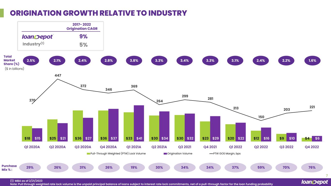 $35 $33 $45 $101 $137 $54 2.0% 2.0% 2.0% 2.5% 3.4% 2.4% – 0.5% 1.0% 1.5% 2.0% 2.5% 3.0% 3.5% 4.0% 0 20 40 60 80 100 120 140 2017 2018 2019 2020 2021 2022 loanDepot Historical Mortgage Origination Volume SCALED ORIGINATOR DELIVERING CUSTOMERS A COMPLETE SOLUTION Inception to FY-22 Origination CAGR: 34%(1) loanDepot Originations loanDepot Market Share $1.7 $2.3 $4.1 Total market volume ($ trillion) $4.0 $2.2 (1) CAGR includes annualized volume for 2010 Source: Historical market share based on MBA industry volume as of 2/21/2023 and historical loanDepot origination volume ($ in billions) The loanDepot Ecosystem Established Scalable Infrastructure 2010 to 2012 Diversification & Expansion 2013 to 2015 Brand, Technology & Operational Transformation 2016 to 2021 Vision 2025 & Beyond 2022 + • Launched with the goal of disrupting mortgage • Created scalable platform and infrastructure • Expanded in-market retail reach through acquisitions • Leveraged infrastructure to launch LD Wholesale • Strategic decision to begin retaining servicing • Launched proprietary mello® technology • Grew servicing book with long-term relationships to a half million loanDepot customers • Launched mellohome and melloInsurance • Acquired leading title insurance company • Formed mello® focused on mortgage adjacent, digital-first products and services • Repositioning the Company for long term value creation • Purpose driven sustainable lending • Simplifying operational structure and increasing operating leverage • Maintaining strong Balance Sheet liquidity • Additions to executive team to position company for next era • Launch of HELOC product $1.8 6 Title Insurance Escrow Services Homeowners Insurance First Mortgage HELOC