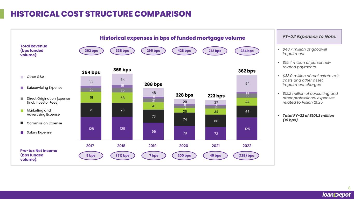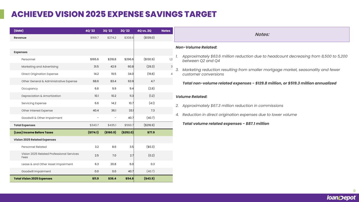 128 129 96 78 72 125 79 78 73 74 68 66 61 58 41 26 34 44 22 25 21 12 14 22 11 15 9 8 7 10 53 64 48 29 27 94 354 bps 369 bps 288 bps 228 bps 223 bps 362 bps 2017 2018 2019 2020 2021 2022 Historical expenses in bps of funded mortgage volume HISTORICAL COST STRUCTURE COMPARISON 8 338 bps 295 bps 428 bps362 bps Total Revenue (bps funded volume): Pre-tax Net Income (bps funded volume): (31) bps 7 bps 200 bps8 bps Salary Expense Marketing and Advertising Expense Direct Origination Expense (incl. Investor Fees) Subservicing Expense Other G&A 272 bps 49 bps Commission Expense 234 bps (128) bps FY-22 Expenses to Note: • $40.7 million of goodwill impairment • $15.4 million of personnel- related payments • $33.0 million of real estate exit costs and other asset impairment charges • $12.2 million of consulting and other professional expenses related to Vision 2025 • Total FY-22 of $101.3 million (19 bps)
