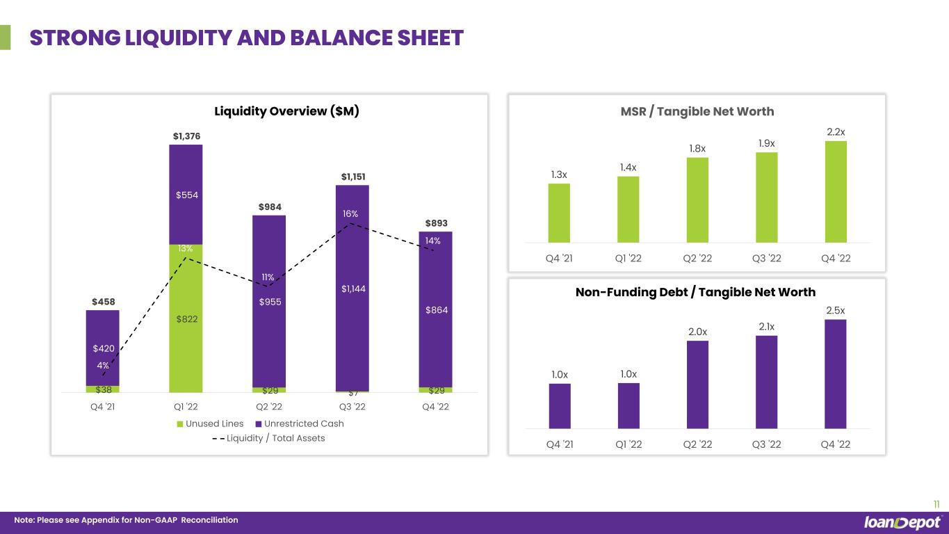 HISTORICAL SERVICING PORTFOLIO TREND 10 ($ in billions) Retention %(2) : Recapture %(1) : (1) Recapture rate is defined as the total unpaid principal balance (“UPB”) of loans in our servicing portfolio that are paid in full for purposes of refinancing the loan on the same property, with the Company acting as lender on both the existing and new loan, divided by the UPB of loans in our servicing portfolio that paid in full for the purpose of refinancing the loan on the same property. (2) Portion of loan origination volume that was sold servicing retained in the period divided by total sold volume in the period. (3) At time of origination. 78% 70% Total Serv Exp$ to Avg. UPB $, bps: 2.3 75% 72% 2.4 58% 72% 2.0 56% 69% 2.4 $162 $153 $155 $140 $141 123 135 142 144 143 - 20 40 60 80 100 120 140 $- $20 $40 $60 $80 $100 $120 $140 $160 $180 Q4'21 Q1 '22 Q2 '22 Q3 '22 Q4 '22 UPB $ MSR FV, bps 61% 65% 2.0 Portfolio @ 12/31/22 W.A. Coupon 3.13% W.A. FICO (3) 737 W.A. LTV 71% W.A. Life (Mths) 18.5 DQ Rate 60D+ 1.0% 90D+ 0.8% Composition GSE 66.5% Gov’t/EBO 26.3% Other 7.2%