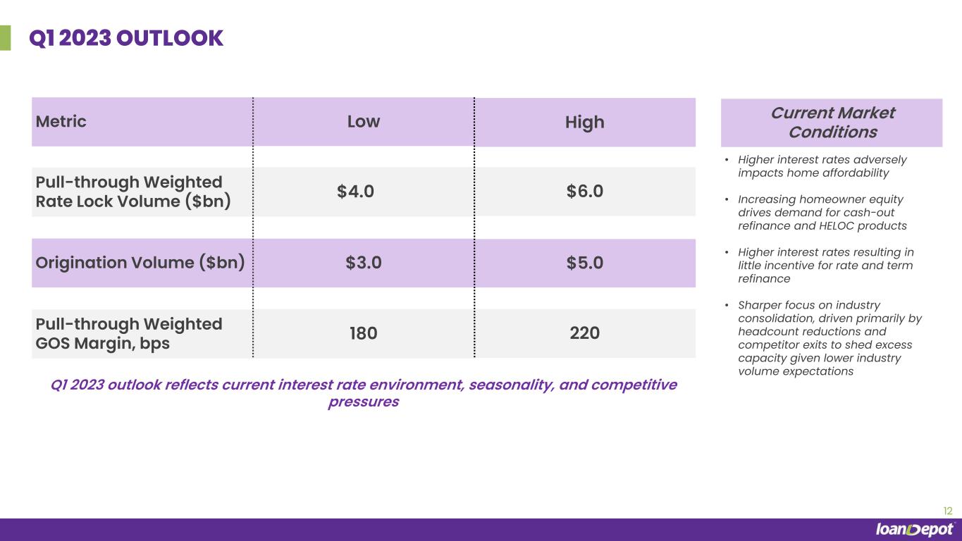 12 Q1 2023 OUTLOOK Metric Low High Pull-through Weighted Rate Lock Volume ($bn) $4.0 $6.0 Origination Volume ($bn) $3.0 $5.0 Pull-through Weighted GOS Margin, bps 180 220 Current Market Conditions • Higher interest rates adversely impacts home affordability • Increasing homeowner equity drives demand for cash-out refinance and HELOC products • Higher interest rates resulting in little incentive for rate and term refinance • Sharper focus on industry consolidation, driven primarily by headcount reductions and competitor exits to shed excess capacity given lower industry volume expectations Q1 2023 outlook reflects current interest rate environment, seasonality, and competitive pressures