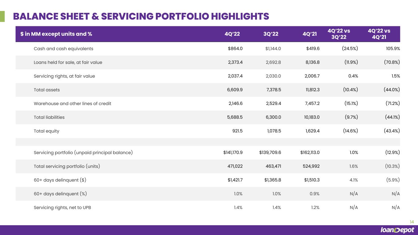 BALANCE SHEET & SERVICING PORTFOLIO HIGHLIGHTS 14 $ in MM except units and % 4Q’22 3Q’22 4Q’21 4Q’22 vs 3Q’22 4Q’22 vs 4Q’21 Cash and cash equivalents $864.0 $1,144.0 $419.6 (24.5%) 105.9% Loans held for sale, at fair value 2,373.4 2,692.8 8,136.8 (11.9%) (70.8%) Servicing rights, at fair value 2,037.4 2,030.0 2,006.7 0.4% 1.5% Total assets 6,609.9 7,378.5 11,812.3 (10.4%) (44.0%) Warehouse and other lines of credit 2,146.6 2,529.4 7,457.2 (15.1%) (71.2%) Total liabilities 5,688.5 6,300.0 10,183.0 (9.7%) (44.1%) Total equity 921.5 1,078.5 1,629.4 (14.6%) (43.4%) Servicing portfolio (unpaid principal balance) $141,170.9 $139,709.6 $162,113.0 1.0% (12.9%) Total servicing portfolio (units) 471,022 463,471 524,992 1.6% (10.3%) 60+ days delinquent ($) $1,421.7 $1,365.8 $1,510.3 4.1% (5.9%) 60+ days delinquent (%) 1.0% 1.0% 0.9% N/A N/A Servicing rights, net to UPB 1.4% 1.4% 1.2% N/A N/A