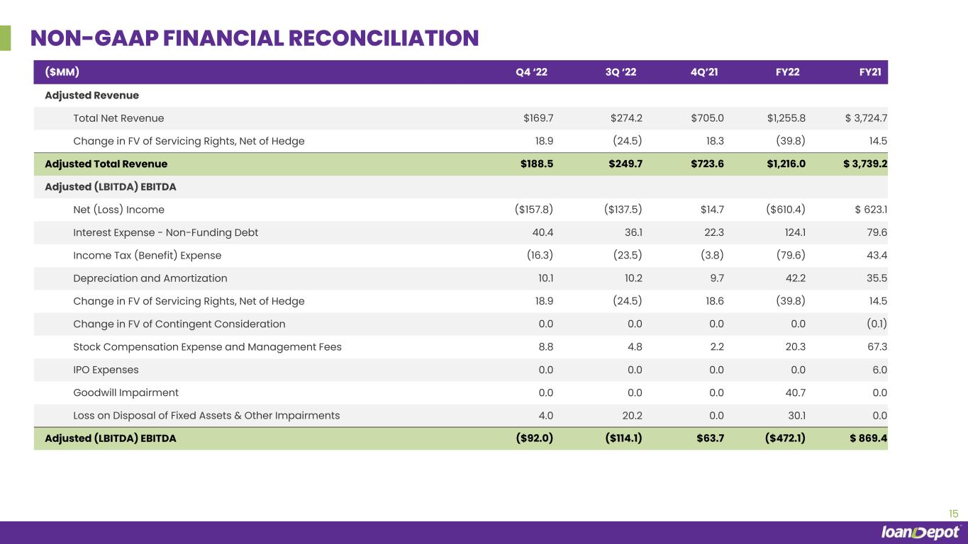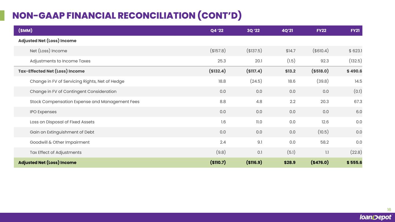NON-GAAP FINANCIAL RECONCILIATION 15 ($MM) Q4 ‘22 3Q ‘22 4Q’21 FY22 FY21 Adjusted Revenue Total Net Revenue $169.7 $274.2 $705.0 $1,255.8 $ 3,724.7 Change in FV of Servicing Rights, Net of Hedge 18.9 (24.5) 18.3 (39.8) 14.5 Adjusted Total Revenue $188.5 $249.7 $723.6 $1,216.0 $ 3,739.2 Adjusted (LBITDA) EBITDA Net (Loss) Income ($157.8) ($137.5) $14.7 ($610.4) $ 623.1 Interest Expense - Non-Funding Debt 40.4 36.1 22.3 124.1 79.6 Income Tax (Benefit) Expense (16.3) (23.5) (3.8) (79.6) 43.4 Depreciation and Amortization 10.1 10.2 9.7 42.2 35.5 Change in FV of Servicing Rights, Net of Hedge 18.9 (24.5) 18.6 (39.8) 14.5 Change in FV of Contingent Consideration 0.0 0.0 0.0 0.0 (0.1) Stock Compensation Expense and Management Fees 8.8 4.8 2.2 20.3 67.3 IPO Expenses 0.0 0.0 0.0 0.0 6.0 Goodwill Impairment 0.0 0.0 0.0 40.7 0.0 Loss on Disposal of Fixed Assets & Other Impairments 4.0 20.2 0.0 30.1 0.0 Adjusted (LBITDA) EBITDA ($92.0) ($114.1) $63.7 ($472.1) $ 869.4