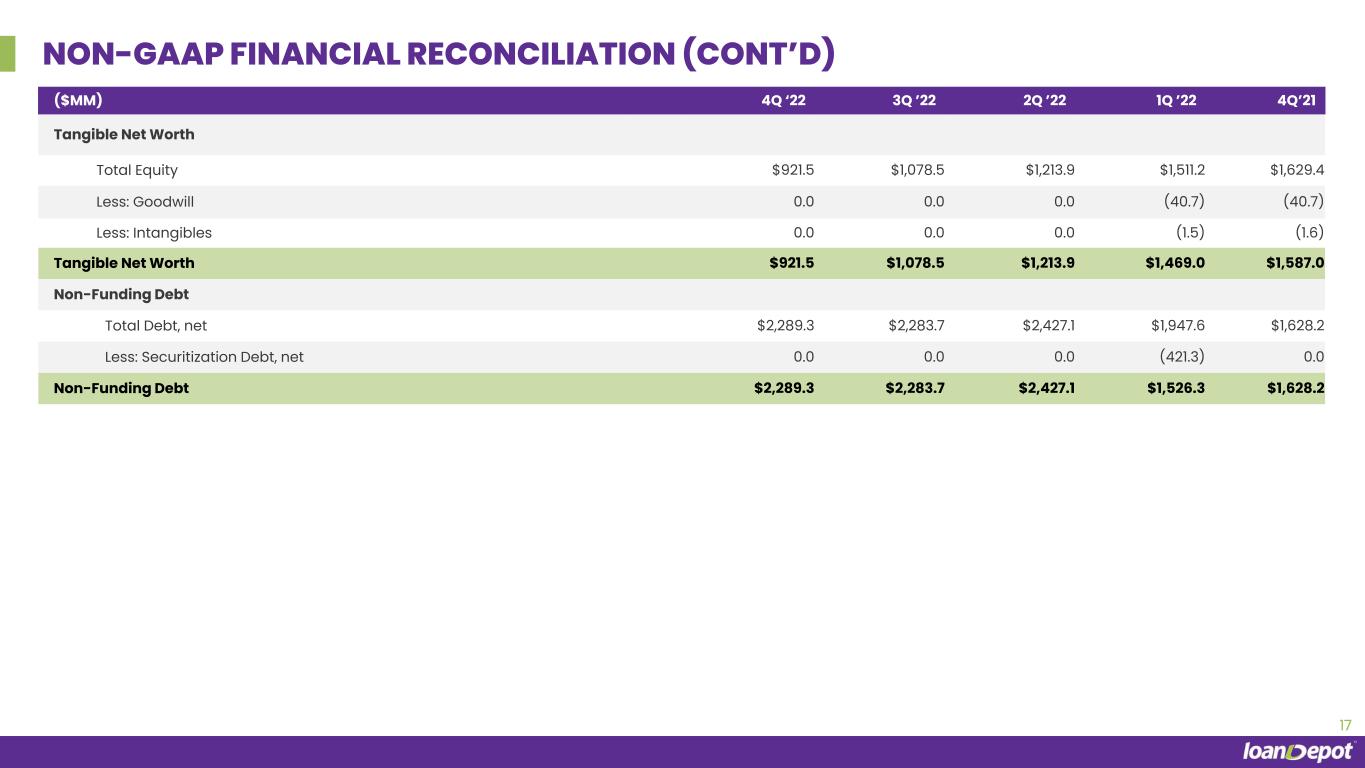NON-GAAP FINANCIAL RECONCILIATION (CONT’D) 16 ($MM) Q4 ‘22 3Q ‘22 4Q’21 FY22 FY21 Adjusted Net (Loss) Income Net (Loss) Income ($157.8) ($137.5) $14.7 ($610.4) $ 623.1 Adjustments to Income Taxes 25.3 20.1 (1.5) 92.3 (132.5) Tax-Effected Net (Loss) Income ($132.4) ($117.4) $13.2 ($518.0) $ 490.6 Change in FV of Servicing Rights, Net of Hedge 18.8 (24.5) 18.6 (39.8) 14.5 Change in FV of Contingent Consideration 0.0 0.0 0.0 0.0 (0.1) Stock Compensation Expense and Management Fees 8.8 4.8 2.2 20.3 67.3 IPO Expenses 0.0 0.0 0.0 0.0 6.0 Loss on Disposal of Fixed Assets 1.6 11.0 0.0 12.6 0.0 Gain on Extinguishment of Debt 0.0 0.0 0.0 (10.5) 0.0 Goodwill & Other Impairment 2.4 9.1 0.0 58.2 0.0 Tax Effect of Adjustments (9.8) 0.1 (5.1) 1.1 (22.8) Adjusted Net (Loss) Income ($110.7) ($116.9) $28.9 ($476.0) $ 555.6