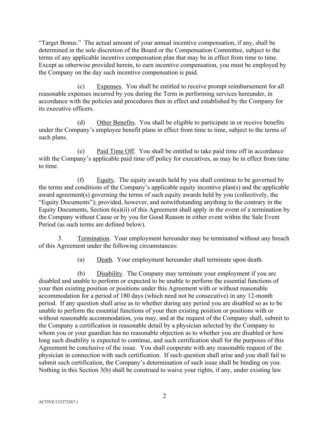 ACTIVE/123273267.1 2 “Target Bonus.” The actual amount of your annual incentive compensation, if any, shall be determined in the sole discretion of the Board or the Compensation Committee, subject to the terms of any applicable incentive compensation plan that may be in effect from time to time. Except as otherwise provided herein, to earn incentive compensation, you must be employed by the Company on the day such incentive compensation is paid. (c) Expenses. You shall be entitled to receive prompt reimbursement for all reasonable expenses incurred by you during the Term in performing services hereunder, in accordance with the policies and procedures then in effect and established by the Company for its executive officers. (d) Other Benefits. You shall be eligible to participate in or receive benefits under the Company’s employee benefit plans in effect from time to time, subject to the terms of such plans. (e) Paid Time Off. You shall be entitled to take paid time off in accordance with the Company’s applicable paid time off policy for executives, as may be in effect from time to time. (f) Equity. The equity awards held by you shall continue to be governed by the terms and conditions of the Company’s applicable equity incentive plan(s) and the applicable award agreement(s) governing the terms of such equity awards held by you (collectively, the “Equity Documents”); provided, however, and notwithstanding anything to the contrary in the Equity Documents, Section 6(a)(ii) of this Agreement shall apply in the event of a termination by the Company without Cause or by you for Good Reason in either event within the Sale Event Period (as such terms are defined below). 3. Termination. Your employment hereunder may be terminated without any breach of this Agreement under the following circumstances: (a) Death. Your employment hereunder shall terminate upon death. (b) Disability. The Company may terminate your employment if you are disabled and unable to perform or expected to be unable to perform the essential functions of your then existing position or positions under this Agreement with or without reasonable accommodation for a period of 180 days (which need not be consecutive) in any 12-month period. If any question shall arise as to whether during any period you are disabled so as to be unable to perform the essential functions of your then existing position or positions with or without reasonable accommodation, you may, and at the request of the Company shall, submit to the Company a certification in reasonable detail by a physician selected by the Company to whom you or your guardian has no reasonable objection as to whether you are disabled or how long such disability is expected to continue, and such certification shall for the purposes of this Agreement be conclusive of the issue. You shall cooperate with any reasonable request of the physician in connection with such certification. If such question shall arise and you shall fail to submit such certification, the Company’s determination of such issue shall be binding on you. Nothing in this Section 3(b) shall be construed to waive your rights, if any, under existing law