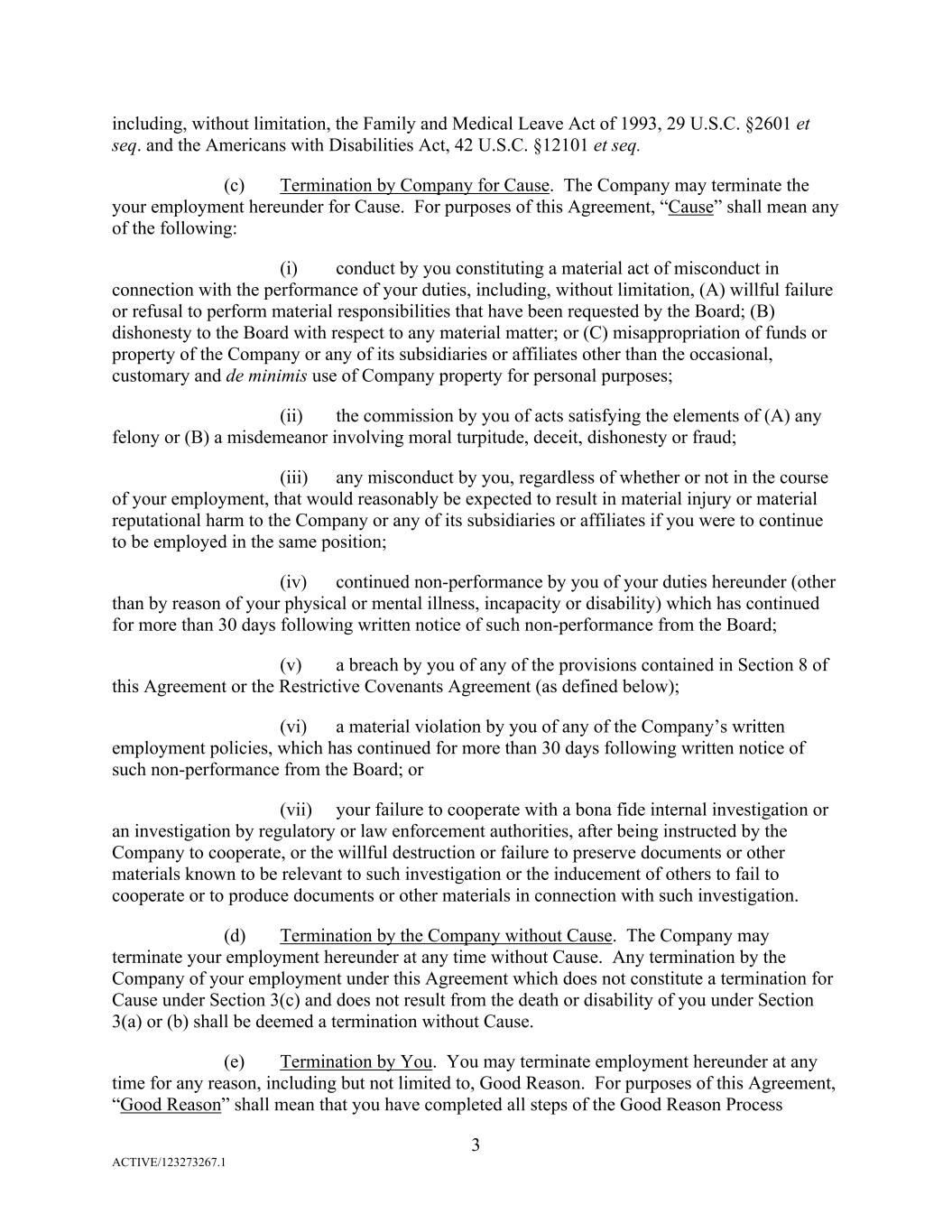 ACTIVE/123273267.1 3 including, without limitation, the Family and Medical Leave Act of 1993, 29 U.S.C. §2601 et seq. and the Americans with Disabilities Act, 42 U.S.C. §12101 et seq. (c) Termination by Company for Cause. The Company may terminate the your employment hereunder for Cause. For purposes of this Agreement, “Cause” shall mean any of the following: (i) conduct by you constituting a material act of misconduct in connection with the performance of your duties, including, without limitation, (A) willful failure or refusal to perform material responsibilities that have been requested by the Board; (B) dishonesty to the Board with respect to any material matter; or (C) misappropriation of funds or property of the Company or any of its subsidiaries or affiliates other than the occasional, customary and de minimis use of Company property for personal purposes; (ii) the commission by you of acts satisfying the elements of (A) any felony or (B) a misdemeanor involving moral turpitude, deceit, dishonesty or fraud; (iii) any misconduct by you, regardless of whether or not in the course of your employment, that would reasonably be expected to result in material injury or material reputational harm to the Company or any of its subsidiaries or affiliates if you were to continue to be employed in the same position; (iv) continued non-performance by you of your duties hereunder (other than by reason of your physical or mental illness, incapacity or disability) which has continued for more than 30 days following written notice of such non-performance from the Board; (v) a breach by you of any of the provisions contained in Section 8 of this Agreement or the Restrictive Covenants Agreement (as defined below); (vi) a material violation by you of any of the Company’s written employment policies, which has continued for more than 30 days following written notice of such non-performance from the Board; or (vii) your failure to cooperate with a bona fide internal investigation or an investigation by regulatory or law enforcement authorities, after being instructed by the Company to cooperate, or the willful destruction or failure to preserve documents or other materials known to be relevant to such investigation or the inducement of others to fail to cooperate or to produce documents or other materials in connection with such investigation. (d) Termination by the Company without Cause. The Company may terminate your employment hereunder at any time without Cause. Any termination by the Company of your employment under this Agreement which does not constitute a termination for Cause under Section 3(c) and does not result from the death or disability of you under Section 3(a) or (b) shall be deemed a termination without Cause. (e) Termination by You. You may terminate employment hereunder at any time for any reason, including but not limited to, Good Reason. For purposes of this Agreement, “Good Reason” shall mean that you have completed all steps of the Good Reason Process