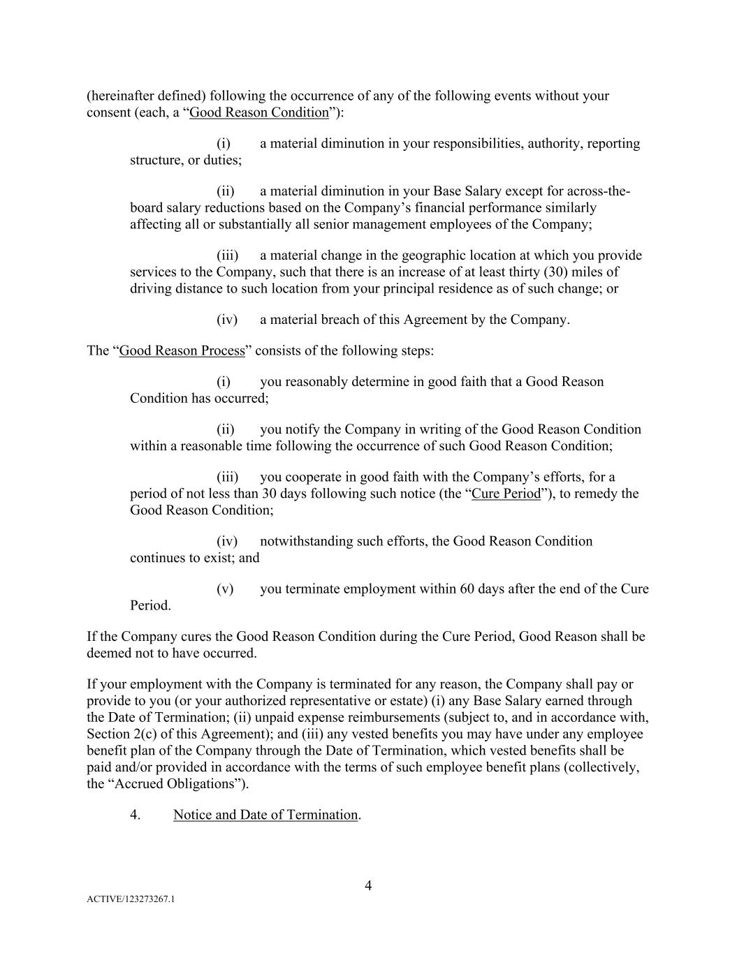ACTIVE/123273267.1 4 (hereinafter defined) following the occurrence of any of the following events without your consent (each, a “Good Reason Condition”): (i) a material diminution in your responsibilities, authority, reporting structure, or duties; (ii) a material diminution in your Base Salary except for across-the- board salary reductions based on the Company’s financial performance similarly affecting all or substantially all senior management employees of the Company; (iii) a material change in the geographic location at which you provide services to the Company, such that there is an increase of at least thirty (30) miles of driving distance to such location from your principal residence as of such change; or (iv) a material breach of this Agreement by the Company. The “Good Reason Process” consists of the following steps: (i) you reasonably determine in good faith that a Good Reason Condition has occurred; (ii) you notify the Company in writing of the Good Reason Condition within a reasonable time following the occurrence of such Good Reason Condition; (iii) you cooperate in good faith with the Company’s efforts, for a period of not less than 30 days following such notice (the “Cure Period”), to remedy the Good Reason Condition; (iv) notwithstanding such efforts, the Good Reason Condition continues to exist; and (v) you terminate employment within 60 days after the end of the Cure Period. If the Company cures the Good Reason Condition during the Cure Period, Good Reason shall be deemed not to have occurred. If your employment with the Company is terminated for any reason, the Company shall pay or provide to you (or your authorized representative or estate) (i) any Base Salary earned through the Date of Termination; (ii) unpaid expense reimbursements (subject to, and in accordance with, Section 2(c) of this Agreement); and (iii) any vested benefits you may have under any employee benefit plan of the Company through the Date of Termination, which vested benefits shall be paid and/or provided in accordance with the terms of such employee benefit plans (collectively, the “Accrued Obligations”). 4. Notice and Date of Termination.