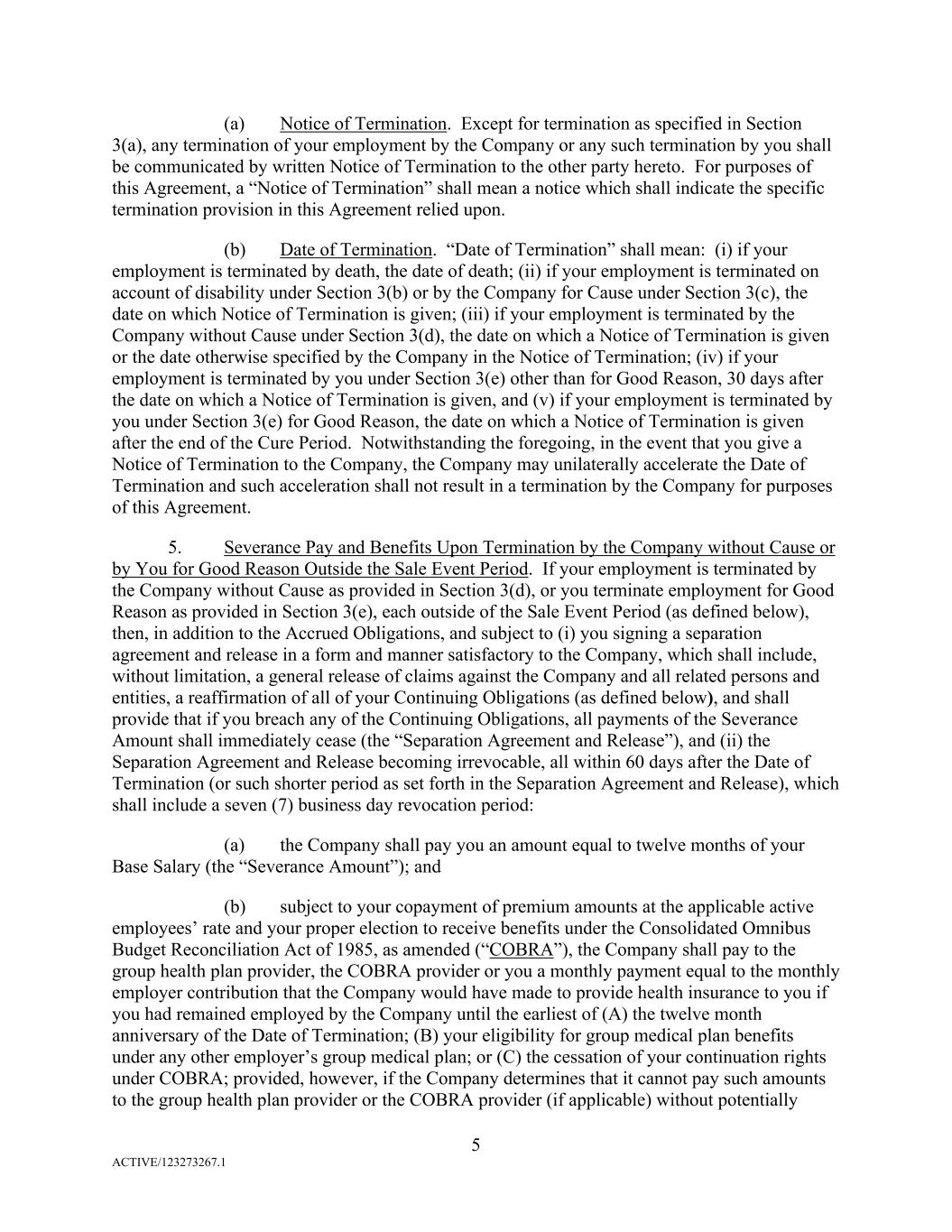 ACTIVE/123273267.1 5 (a) Notice of Termination. Except for termination as specified in Section 3(a), any termination of your employment by the Company or any such termination by you shall be communicated by written Notice of Termination to the other party hereto. For purposes of this Agreement, a “Notice of Termination” shall mean a notice which shall indicate the specific termination provision in this Agreement relied upon. (b) Date of Termination. “Date of Termination” shall mean: (i) if your employment is terminated by death, the date of death; (ii) if your employment is terminated on account of disability under Section 3(b) or by the Company for Cause under Section 3(c), the date on which Notice of Termination is given; (iii) if your employment is terminated by the Company without Cause under Section 3(d), the date on which a Notice of Termination is given or the date otherwise specified by the Company in the Notice of Termination; (iv) if your employment is terminated by you under Section 3(e) other than for Good Reason, 30 days after the date on which a Notice of Termination is given, and (v) if your employment is terminated by you under Section 3(e) for Good Reason, the date on which a Notice of Termination is given after the end of the Cure Period. Notwithstanding the foregoing, in the event that you give a Notice of Termination to the Company, the Company may unilaterally accelerate the Date of Termination and such acceleration shall not result in a termination by the Company for purposes of this Agreement. 5. Severance Pay and Benefits Upon Termination by the Company without Cause or by You for Good Reason Outside the Sale Event Period. If your employment is terminated by the Company without Cause as provided in Section 3(d), or you terminate employment for Good Reason as provided in Section 3(e), each outside of the Sale Event Period (as defined below), then, in addition to the Accrued Obligations, and subject to (i) you signing a separation agreement and release in a form and manner satisfactory to the Company, which shall include, without limitation, a general release of claims against the Company and all related persons and entities, a reaffirmation of all of your Continuing Obligations (as defined below), and shall provide that if you breach any of the Continuing Obligations, all payments of the Severance Amount shall immediately cease (the “Separation Agreement and Release”), and (ii) the Separation Agreement and Release becoming irrevocable, all within 60 days after the Date of Termination (or such shorter period as set forth in the Separation Agreement and Release), which shall include a seven (7) business day revocation period: (a) the Company shall pay you an amount equal to twelve months of your Base Salary (the “Severance Amount”); and (b) subject to your copayment of premium amounts at the applicable active employees’ rate and your proper election to receive benefits under the Consolidated Omnibus Budget Reconciliation Act of 1985, as amended (“COBRA”), the Company shall pay to the group health plan provider, the COBRA provider or you a monthly payment equal to the monthly employer contribution that the Company would have made to provide health insurance to you if you had remained employed by the Company until the earliest of (A) the twelve month anniversary of the Date of Termination; (B) your eligibility for group medical plan benefits under any other employer’s group medical plan; or (C) the cessation of your continuation rights under COBRA; provided, however, if the Company determines that it cannot pay such amounts to the group health plan provider or the COBRA provider (if applicable) without potentially