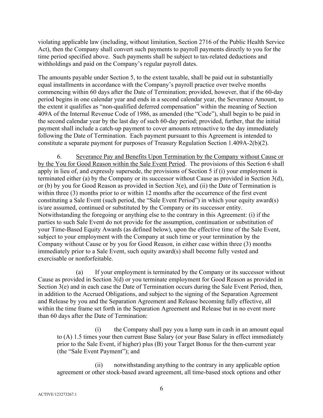 ACTIVE/123273267.1 6 violating applicable law (including, without limitation, Section 2716 of the Public Health Service Act), then the Company shall convert such payments to payroll payments directly to you for the time period specified above. Such payments shall be subject to tax-related deductions and withholdings and paid on the Company’s regular payroll dates. The amounts payable under Section 5, to the extent taxable, shall be paid out in substantially equal installments in accordance with the Company’s payroll practice over twelve months commencing within 60 days after the Date of Termination; provided, however, that if the 60-day period begins in one calendar year and ends in a second calendar year, the Severance Amount, to the extent it qualifies as “non-qualified deferred compensation” within the meaning of Section 409A of the Internal Revenue Code of 1986, as amended (the “Code”), shall begin to be paid in the second calendar year by the last day of such 60-day period; provided, further, that the initial payment shall include a catch-up payment to cover amounts retroactive to the day immediately following the Date of Termination. Each payment pursuant to this Agreement is intended to constitute a separate payment for purposes of Treasury Regulation Section 1.409A-2(b)(2). 6. Severance Pay and Benefits Upon Termination by the Company without Cause or by the You for Good Reason within the Sale Event Period. The provisions of this Section 6 shall apply in lieu of, and expressly supersede, the provisions of Section 5 if (i) your employment is terminated either (a) by the Company or its successor without Cause as provided in Section 3(d), or (b) by you for Good Reason as provided in Section 3(e), and (ii) the Date of Termination is within three (3) months prior to or within 12 months after the occurrence of the first event constituting a Sale Event (such period, the “Sale Event Period”) in which your equity award(s) is/are assumed, continued or substituted by the Company or its successor entity. Notwithstanding the foregoing or anything else to the contrary in this Agreement: (i) if the parties to such Sale Event do not provide for the assumption, continuation or substitution of your Time-Based Equity Awards (as defined below), upon the effective time of the Sale Event, subject to your employment with the Company at such time or your termination by the Company without Cause or by you for Good Reason, in either case within three (3) months immediately prior to a Sale Event, such equity award(s) shall become fully vested and exercisable or nonforfeitable. (a) If your employment is terminated by the Company or its successor without Cause as provided in Section 3(d) or you terminate employment for Good Reason as provided in Section 3(e) and in each case the Date of Termination occurs during the Sale Event Period, then, in addition to the Accrued Obligations, and subject to the signing of the Separation Agreement and Release by you and the Separation Agreement and Release becoming fully effective, all within the time frame set forth in the Separation Agreement and Release but in no event more than 60 days after the Date of Termination: (i) the Company shall pay you a lump sum in cash in an amount equal to (A) 1.5 times your then current Base Salary (or your Base Salary in effect immediately prior to the Sale Event, if higher) plus (B) your Target Bonus for the then-current year (the “Sale Event Payment”); and (ii) notwithstanding anything to the contrary in any applicable option agreement or other stock-based award agreement, all time-based stock options and other