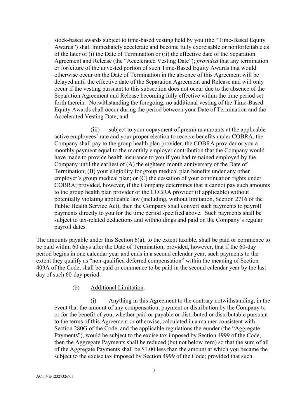 ACTIVE/123273267.1 7 stock-based awards subject to time-based vesting held by you (the “Time-Based Equity Awards”) shall immediately accelerate and become fully exercisable or nonforfeitable as of the later of (i) the Date of Termination or (ii) the effective date of the Separation Agreement and Release (the “Accelerated Vesting Date”); provided that any termination or forfeiture of the unvested portion of such Time-Based Equity Awards that would otherwise occur on the Date of Termination in the absence of this Agreement will be delayed until the effective date of the Separation Agreement and Release and will only occur if the vesting pursuant to this subsection does not occur due to the absence of the Separation Agreement and Release becoming fully effective within the time period set forth therein. Notwithstanding the foregoing, no additional vesting of the Time-Based Equity Awards shall occur during the period between your Date of Termination and the Accelerated Vesting Date; and (iii) subject to your copayment of premium amounts at the applicable active employees’ rate and your proper election to receive benefits under COBRA, the Company shall pay to the group health plan provider, the COBRA provider or you a monthly payment equal to the monthly employer contribution that the Company would have made to provide health insurance to you if you had remained employed by the Company until the earliest of (A) the eighteen month anniversary of the Date of Termination; (B) your eligibility for group medical plan benefits under any other employer’s group medical plan; or (C) the cessation of your continuation rights under COBRA; provided, however, if the Company determines that it cannot pay such amounts to the group health plan provider or the COBRA provider (if applicable) without potentially violating applicable law (including, without limitation, Section 2716 of the Public Health Service Act), then the Company shall convert such payments to payroll payments directly to you for the time period specified above. Such payments shall be subject to tax-related deductions and withholdings and paid on the Company’s regular payroll dates. The amounts payable under this Section 6(a), to the extent taxable, shall be paid or commence to be paid within 60 days after the Date of Termination; provided, however, that if the 60-day period begins in one calendar year and ends in a second calendar year, such payments to the extent they qualify as “non-qualified deferred compensation” within the meaning of Section 409A of the Code, shall be paid or commence to be paid in the second calendar year by the last day of such 60-day period. (b) Additional Limitation. (i) Anything in this Agreement to the contrary notwithstanding, in the event that the amount of any compensation, payment or distribution by the Company to or for the benefit of you, whether paid or payable or distributed or distributable pursuant to the terms of this Agreement or otherwise, calculated in a manner consistent with Section 280G of the Code, and the applicable regulations thereunder (the “Aggregate Payments”), would be subject to the excise tax imposed by Section 4999 of the Code, then the Aggregate Payments shall be reduced (but not below zero) so that the sum of all of the Aggregate Payments shall be $1.00 less than the amount at which you became the subject to the excise tax imposed by Section 4999 of the Code; provided that such