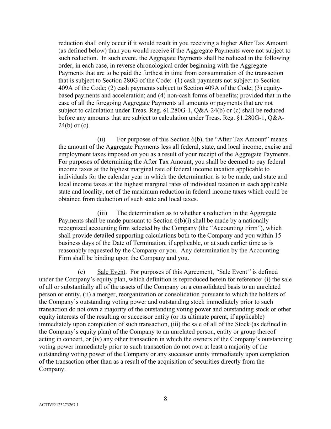 ACTIVE/123273267.1 8 reduction shall only occur if it would result in you receiving a higher After Tax Amount (as defined below) than you would receive if the Aggregate Payments were not subject to such reduction. In such event, the Aggregate Payments shall be reduced in the following order, in each case, in reverse chronological order beginning with the Aggregate Payments that are to be paid the furthest in time from consummation of the transaction that is subject to Section 280G of the Code: (1) cash payments not subject to Section 409A of the Code; (2) cash payments subject to Section 409A of the Code; (3) equity- based payments and acceleration; and (4) non-cash forms of benefits; provided that in the case of all the foregoing Aggregate Payments all amounts or payments that are not subject to calculation under Treas. Reg. §1.280G-1, Q&A-24(b) or (c) shall be reduced before any amounts that are subject to calculation under Treas. Reg. §1.280G-1, Q&A- 24(b) or (c). (ii) For purposes of this Section 6(b), the “After Tax Amount” means the amount of the Aggregate Payments less all federal, state, and local income, excise and employment taxes imposed on you as a result of your receipt of the Aggregate Payments. For purposes of determining the After Tax Amount, you shall be deemed to pay federal income taxes at the highest marginal rate of federal income taxation applicable to individuals for the calendar year in which the determination is to be made, and state and local income taxes at the highest marginal rates of individual taxation in each applicable state and locality, net of the maximum reduction in federal income taxes which could be obtained from deduction of such state and local taxes. (iii) The determination as to whether a reduction in the Aggregate Payments shall be made pursuant to Section 6(b)(i) shall be made by a nationally recognized accounting firm selected by the Company (the “Accounting Firm”), which shall provide detailed supporting calculations both to the Company and you within 15 business days of the Date of Termination, if applicable, or at such earlier time as is reasonably requested by the Company or you. Any determination by the Accounting Firm shall be binding upon the Company and you. (c) Sale Event. For purposes of this Agreement, “Sale Event” is defined under the Company’s equity plan, which definition is reproduced herein for reference: (i) the sale of all or substantially all of the assets of the Company on a consolidated basis to an unrelated person or entity, (ii) a merger, reorganization or consolidation pursuant to which the holders of the Company’s outstanding voting power and outstanding stock immediately prior to such transaction do not own a majority of the outstanding voting power and outstanding stock or other equity interests of the resulting or successor entity (or its ultimate parent, if applicable) immediately upon completion of such transaction, (iii) the sale of all of the Stock (as defined in the Company’s equity plan) of the Company to an unrelated person, entity or group thereof acting in concert, or (iv) any other transaction in which the owners of the Company’s outstanding voting power immediately prior to such transaction do not own at least a majority of the outstanding voting power of the Company or any successor entity immediately upon completion of the transaction other than as a result of the acquisition of securities directly from the Company.