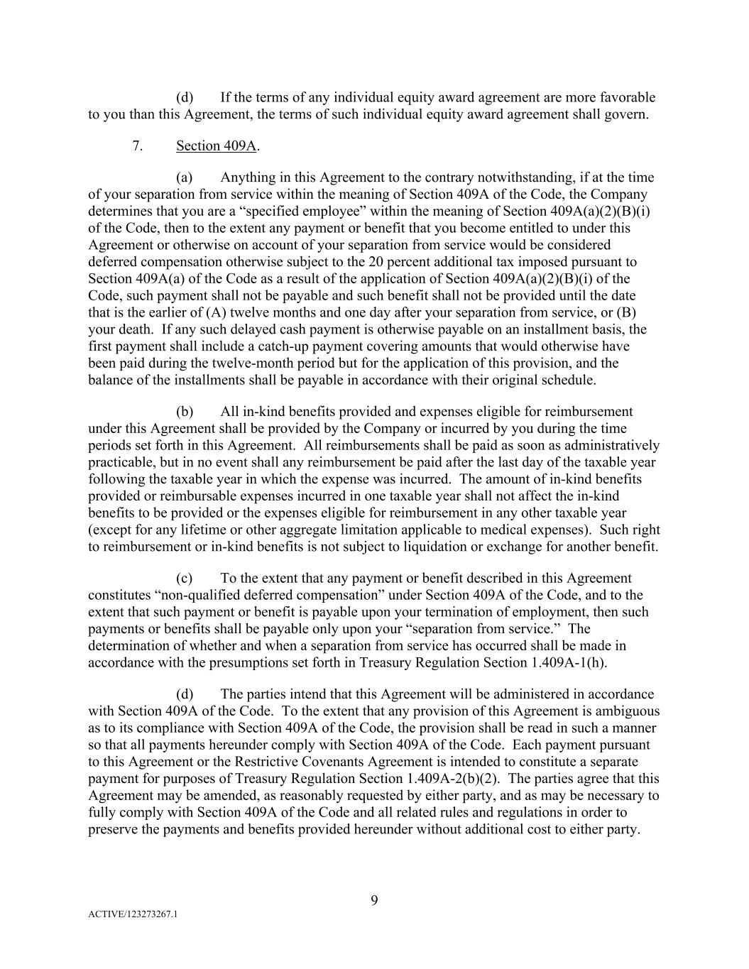 ACTIVE/123273267.1 9 (d) If the terms of any individual equity award agreement are more favorable to you than this Agreement, the terms of such individual equity award agreement shall govern. 7. Section 409A. (a) Anything in this Agreement to the contrary notwithstanding, if at the time of your separation from service within the meaning of Section 409A of the Code, the Company determines that you are a “specified employee” within the meaning of Section 409A(a)(2)(B)(i) of the Code, then to the extent any payment or benefit that you become entitled to under this Agreement or otherwise on account of your separation from service would be considered deferred compensation otherwise subject to the 20 percent additional tax imposed pursuant to Section 409A(a) of the Code as a result of the application of Section 409A(a)(2)(B)(i) of the Code, such payment shall not be payable and such benefit shall not be provided until the date that is the earlier of (A) twelve months and one day after your separation from service, or (B) your death. If any such delayed cash payment is otherwise payable on an installment basis, the first payment shall include a catch-up payment covering amounts that would otherwise have been paid during the twelve-month period but for the application of this provision, and the balance of the installments shall be payable in accordance with their original schedule. (b) All in-kind benefits provided and expenses eligible for reimbursement under this Agreement shall be provided by the Company or incurred by you during the time periods set forth in this Agreement. All reimbursements shall be paid as soon as administratively practicable, but in no event shall any reimbursement be paid after the last day of the taxable year following the taxable year in which the expense was incurred. The amount of in-kind benefits provided or reimbursable expenses incurred in one taxable year shall not affect the in-kind benefits to be provided or the expenses eligible for reimbursement in any other taxable year (except for any lifetime or other aggregate limitation applicable to medical expenses). Such right to reimbursement or in-kind benefits is not subject to liquidation or exchange for another benefit. (c) To the extent that any payment or benefit described in this Agreement constitutes “non-qualified deferred compensation” under Section 409A of the Code, and to the extent that such payment or benefit is payable upon your termination of employment, then such payments or benefits shall be payable only upon your “separation from service.” The determination of whether and when a separation from service has occurred shall be made in accordance with the presumptions set forth in Treasury Regulation Section 1.409A-1(h). (d) The parties intend that this Agreement will be administered in accordance with Section 409A of the Code. To the extent that any provision of this Agreement is ambiguous as to its compliance with Section 409A of the Code, the provision shall be read in such a manner so that all payments hereunder comply with Section 409A of the Code. Each payment pursuant to this Agreement or the Restrictive Covenants Agreement is intended to constitute a separate payment for purposes of Treasury Regulation Section 1.409A-2(b)(2). The parties agree that this Agreement may be amended, as reasonably requested by either party, and as may be necessary to fully comply with Section 409A of the Code and all related rules and regulations in order to preserve the payments and benefits provided hereunder without additional cost to either party.