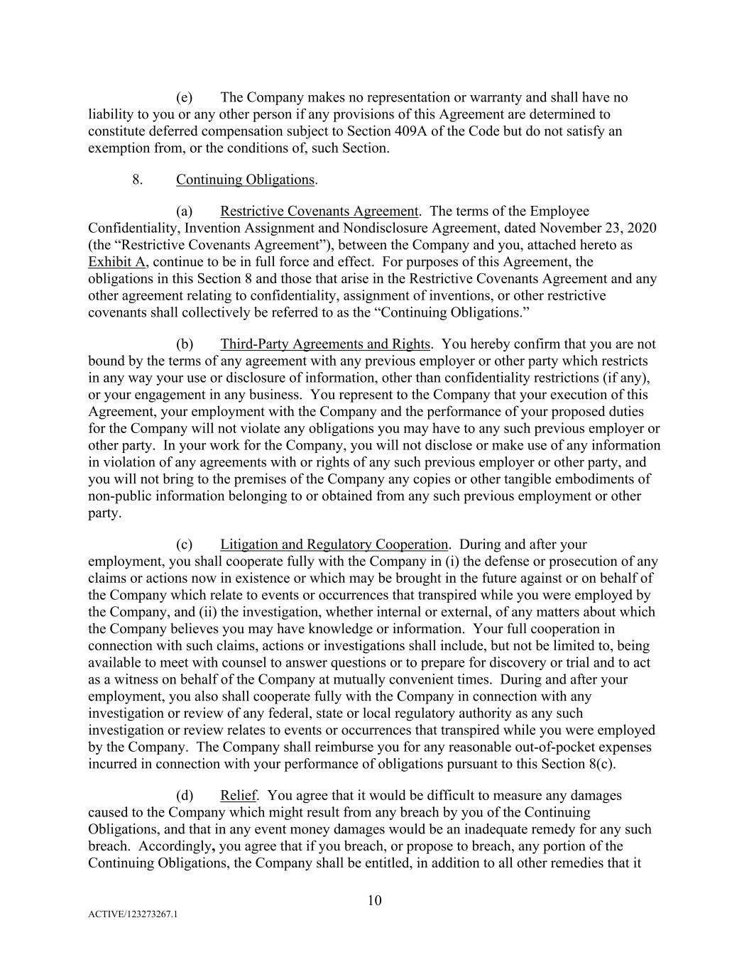 ACTIVE/123273267.1 10 (e) The Company makes no representation or warranty and shall have no liability to you or any other person if any provisions of this Agreement are determined to constitute deferred compensation subject to Section 409A of the Code but do not satisfy an exemption from, or the conditions of, such Section. 8. Continuing Obligations. (a) Restrictive Covenants Agreement. The terms of the Employee Confidentiality, Invention Assignment and Nondisclosure Agreement, dated November 23, 2020 (the “Restrictive Covenants Agreement”), between the Company and you, attached hereto as Exhibit A, continue to be in full force and effect. For purposes of this Agreement, the obligations in this Section 8 and those that arise in the Restrictive Covenants Agreement and any other agreement relating to confidentiality, assignment of inventions, or other restrictive covenants shall collectively be referred to as the “Continuing Obligations.” (b) Third-Party Agreements and Rights. You hereby confirm that you are not bound by the terms of any agreement with any previous employer or other party which restricts in any way your use or disclosure of information, other than confidentiality restrictions (if any), or your engagement in any business. You represent to the Company that your execution of this Agreement, your employment with the Company and the performance of your proposed duties for the Company will not violate any obligations you may have to any such previous employer or other party. In your work for the Company, you will not disclose or make use of any information in violation of any agreements with or rights of any such previous employer or other party, and you will not bring to the premises of the Company any copies or other tangible embodiments of non-public information belonging to or obtained from any such previous employment or other party. (c) Litigation and Regulatory Cooperation. During and after your employment, you shall cooperate fully with the Company in (i) the defense or prosecution of any claims or actions now in existence or which may be brought in the future against or on behalf of the Company which relate to events or occurrences that transpired while you were employed by the Company, and (ii) the investigation, whether internal or external, of any matters about which the Company believes you may have knowledge or information. Your full cooperation in connection with such claims, actions or investigations shall include, but not be limited to, being available to meet with counsel to answer questions or to prepare for discovery or trial and to act as a witness on behalf of the Company at mutually convenient times. During and after your employment, you also shall cooperate fully with the Company in connection with any investigation or review of any federal, state or local regulatory authority as any such investigation or review relates to events or occurrences that transpired while you were employed by the Company. The Company shall reimburse you for any reasonable out-of-pocket expenses incurred in connection with your performance of obligations pursuant to this Section 8(c). (d) Relief. You agree that it would be difficult to measure any damages caused to the Company which might result from any breach by you of the Continuing Obligations, and that in any event money damages would be an inadequate remedy for any such breach. Accordingly, you agree that if you breach, or propose to breach, any portion of the Continuing Obligations, the Company shall be entitled, in addition to all other remedies that it