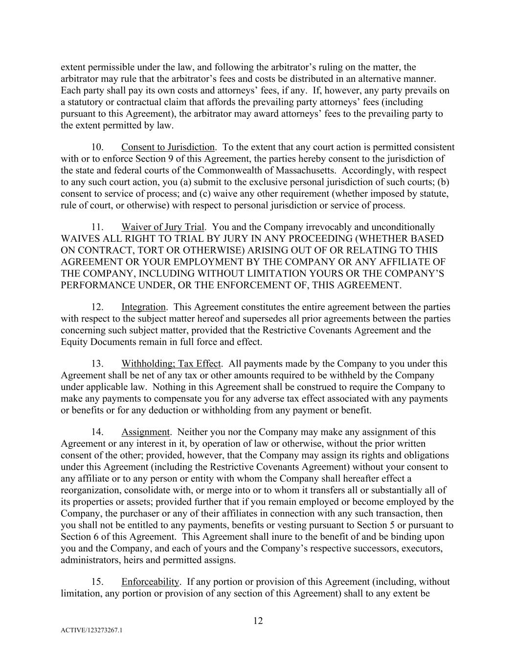 ACTIVE/123273267.1 12 extent permissible under the law, and following the arbitrator’s ruling on the matter, the arbitrator may rule that the arbitrator’s fees and costs be distributed in an alternative manner. Each party shall pay its own costs and attorneys’ fees, if any. If, however, any party prevails on a statutory or contractual claim that affords the prevailing party attorneys’ fees (including pursuant to this Agreement), the arbitrator may award attorneys’ fees to the prevailing party to the extent permitted by law. 10. Consent to Jurisdiction. To the extent that any court action is permitted consistent with or to enforce Section 9 of this Agreement, the parties hereby consent to the jurisdiction of the state and federal courts of the Commonwealth of Massachusetts. Accordingly, with respect to any such court action, you (a) submit to the exclusive personal jurisdiction of such courts; (b) consent to service of process; and (c) waive any other requirement (whether imposed by statute, rule of court, or otherwise) with respect to personal jurisdiction or service of process. 11. Waiver of Jury Trial. You and the Company irrevocably and unconditionally WAIVES ALL RIGHT TO TRIAL BY JURY IN ANY PROCEEDING (WHETHER BASED ON CONTRACT, TORT OR OTHERWISE) ARISING OUT OF OR RELATING TO THIS AGREEMENT OR YOUR EMPLOYMENT BY THE COMPANY OR ANY AFFILIATE OF THE COMPANY, INCLUDING WITHOUT LIMITATION YOURS OR THE COMPANY’S PERFORMANCE UNDER, OR THE ENFORCEMENT OF, THIS AGREEMENT. 12. Integration. This Agreement constitutes the entire agreement between the parties with respect to the subject matter hereof and supersedes all prior agreements between the parties concerning such subject matter, provided that the Restrictive Covenants Agreement and the Equity Documents remain in full force and effect. 13. Withholding; Tax Effect. All payments made by the Company to you under this Agreement shall be net of any tax or other amounts required to be withheld by the Company under applicable law. Nothing in this Agreement shall be construed to require the Company to make any payments to compensate you for any adverse tax effect associated with any payments or benefits or for any deduction or withholding from any payment or benefit. 14. Assignment. Neither you nor the Company may make any assignment of this Agreement or any interest in it, by operation of law or otherwise, without the prior written consent of the other; provided, however, that the Company may assign its rights and obligations under this Agreement (including the Restrictive Covenants Agreement) without your consent to any affiliate or to any person or entity with whom the Company shall hereafter effect a reorganization, consolidate with, or merge into or to whom it transfers all or substantially all of its properties or assets; provided further that if you remain employed or become employed by the Company, the purchaser or any of their affiliates in connection with any such transaction, then you shall not be entitled to any payments, benefits or vesting pursuant to Section 5 or pursuant to Section 6 of this Agreement. This Agreement shall inure to the benefit of and be binding upon you and the Company, and each of yours and the Company’s respective successors, executors, administrators, heirs and permitted assigns. 15. Enforceability. If any portion or provision of this Agreement (including, without limitation, any portion or provision of any section of this Agreement) shall to any extent be