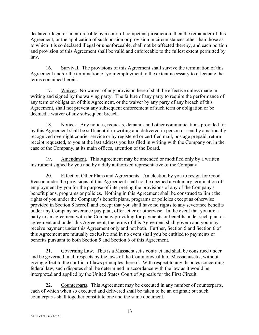 ACTIVE/123273267.1 13 declared illegal or unenforceable by a court of competent jurisdiction, then the remainder of this Agreement, or the application of such portion or provision in circumstances other than those as to which it is so declared illegal or unenforceable, shall not be affected thereby, and each portion and provision of this Agreement shall be valid and enforceable to the fullest extent permitted by law. 16. Survival. The provisions of this Agreement shall survive the termination of this Agreement and/or the termination of your employment to the extent necessary to effectuate the terms contained herein. 17. Waiver. No waiver of any provision hereof shall be effective unless made in writing and signed by the waiving party. The failure of any party to require the performance of any term or obligation of this Agreement, or the waiver by any party of any breach of this Agreement, shall not prevent any subsequent enforcement of such term or obligation or be deemed a waiver of any subsequent breach. 18. Notices. Any notices, requests, demands and other communications provided for by this Agreement shall be sufficient if in writing and delivered in person or sent by a nationally recognized overnight courier service or by registered or certified mail, postage prepaid, return receipt requested, to you at the last address you has filed in writing with the Company or, in the case of the Company, at its main offices, attention of the Board. 19. Amendment. This Agreement may be amended or modified only by a written instrument signed by you and by a duly authorized representative of the Company. 20. Effect on Other Plans and Agreements. An election by you to resign for Good Reason under the provisions of this Agreement shall not be deemed a voluntary termination of employment by you for the purpose of interpreting the provisions of any of the Company's benefit plans, programs or policies. Nothing in this Agreement shall be construed to limit the rights of you under the Company’s benefit plans, programs or policies except as otherwise provided in Section 8 hereof, and except that you shall have no rights to any severance benefits under any Company severance pay plan, offer letter or otherwise. In the event that you are a party to an agreement with the Company providing for payments or benefits under such plan or agreement and under this Agreement, the terms of this Agreement shall govern and you may receive payment under this Agreement only and not both. Further, Section 5 and Section 6 of this Agreement are mutually exclusive and in no event shall you be entitled to payments or benefits pursuant to both Section 5 and Section 6 of this Agreement. 21. Governing Law. This is a Massachusetts contract and shall be construed under and be governed in all respects by the laws of the Commonwealth of Massachusetts, without giving effect to the conflict of laws principles thereof. With respect to any disputes concerning federal law, such disputes shall be determined in accordance with the law as it would be interpreted and applied by the United States Court of Appeals for the First Circuit. 22. Counterparts. This Agreement may be executed in any number of counterparts, each of which when so executed and delivered shall be taken to be an original; but such counterparts shall together constitute one and the same document.
