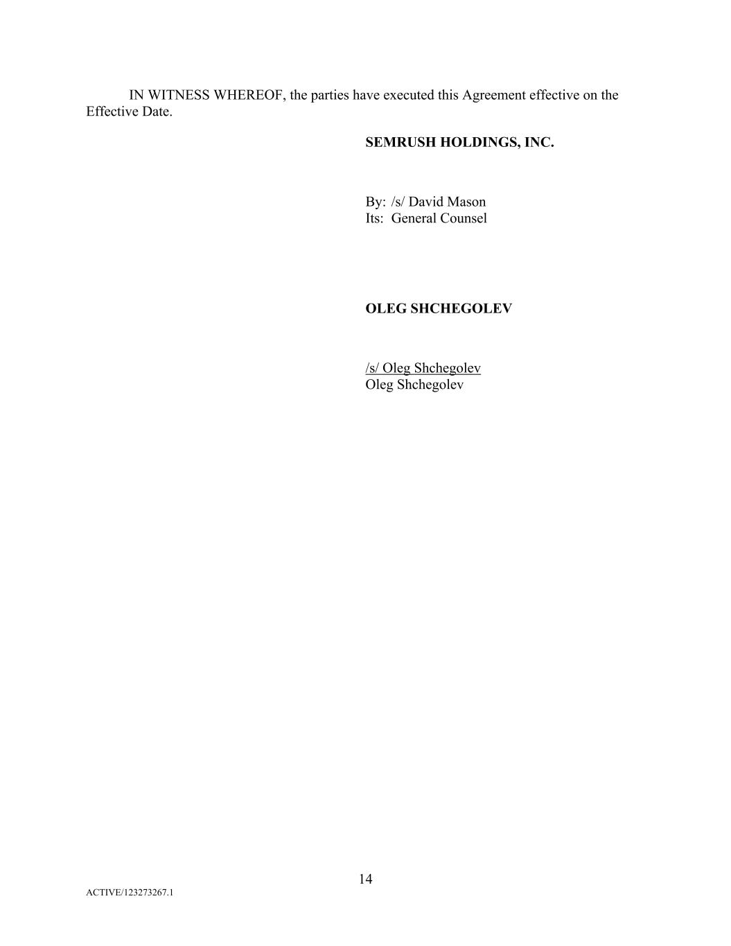 ACTIVE/123273267.1 14 IN WITNESS WHEREOF, the parties have executed this Agreement effective on the Effective Date. SEMRUSH HOLDINGS, INC. By: /s/ David Mason Its: General Counsel OLEG SHCHEGOLEV /s/ Oleg Shchegolev Oleg Shchegolev