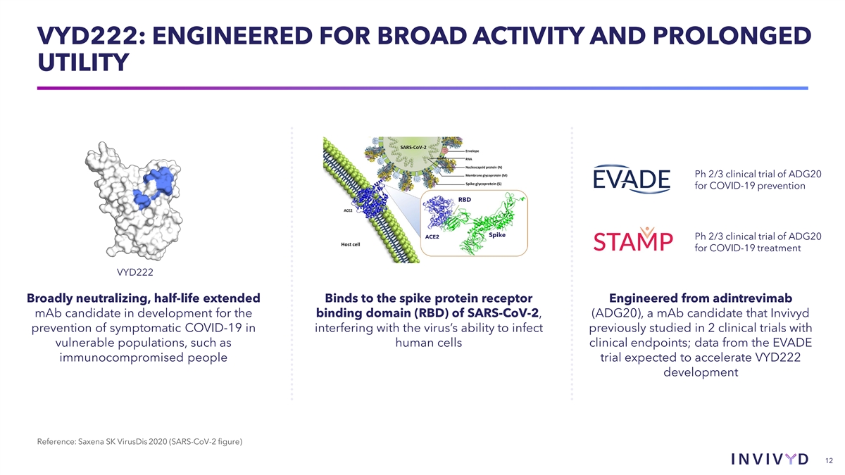 VYD222: ENGINEERED FOR BROAD ACTIVITY AND PROLONGED UTILITY Ph 2/3 clinical trial of ADG20 for COVID-19 prevention RBD Spike ACE2 Ph 2/3 clinical trial of ADG20 for COVID-19 treatment VYD222 Broadly neutralizing, half-life extended Binds to the spike protein receptor Engineered from adintrevimab mAb candidate in development for the binding domain (RBD) of SARS-CoV-2, (ADG20), a mAb candidate that Invivyd prevention of symptomatic COVID-19 in interfering with the virus’s ability to infect previously studied in 2 clinical trials with vulnerable populations, such as human cells clinical endpoints; data from the EVADE immunocompromised people trial expected to accelerate VYD222 development Reference: Saxena SK VirusDis 2020 (SARS-CoV-2 figure) 12