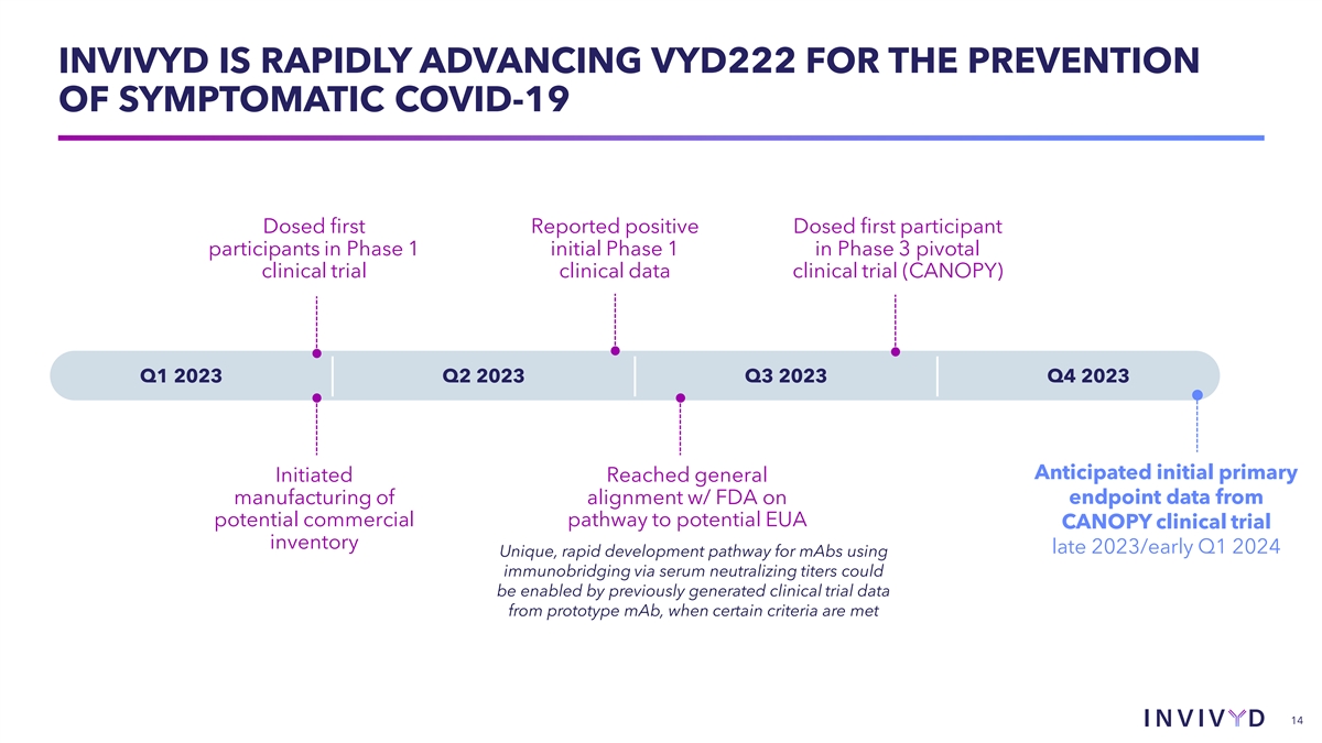 VYD222 HAS DEMONSTRATED BROAD IN VITRO NEUTRALIZING ACTIVITY AGAINST VARIOUS PRE-OMICRON AND OMICRON VARIANTS 1 VARIANT SUBLINEAGE VYD222 WT(D614G) WT(D614G) ✓ Delta B.1.617.2 ✓ BA.1 ✓ BA.4/5 ✓ BA.4.6 ✓ BF.7 ✓ Omicron XBB.1 ✓ XBB.1.5 ✓ XBB.1.5.10 and EG.5 (one of the XBB.1.16 ✓ dominant variants in the U.S.) have the 2-3 same mutations in the spike protein XBB.1.5.10 ✓ References: 1. VYD222 data generated by Labcorp-Monogram Biosciences using the ✓ Neutralizing in standardized in vitro assays pseudovirus PhenoSense® SARS-CoV-2 Neutralizing Antibody Assay; 2. https://covid.cdc.gov/covid-data-tracker/#variant-proportions (accessed Sept 6, 2023); 3. covSPECTRUM.org (accessed Sept 7, 2023) 13