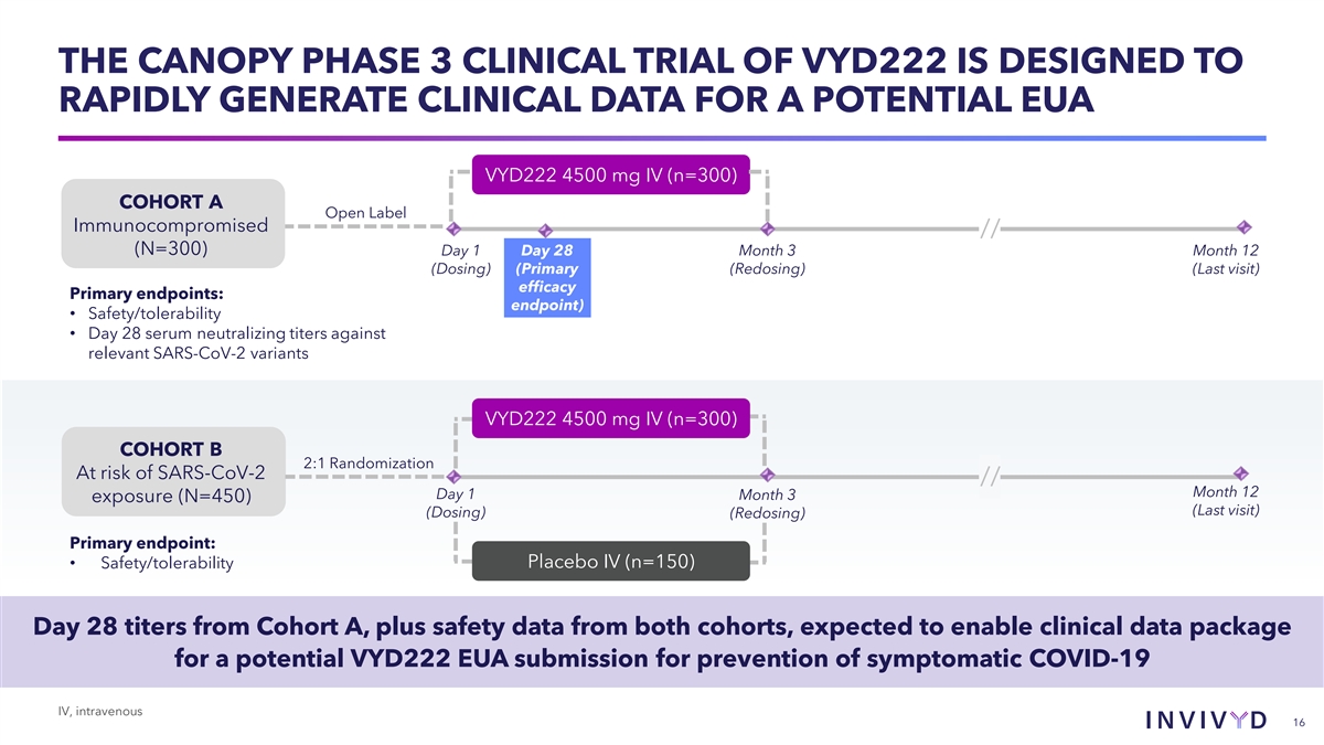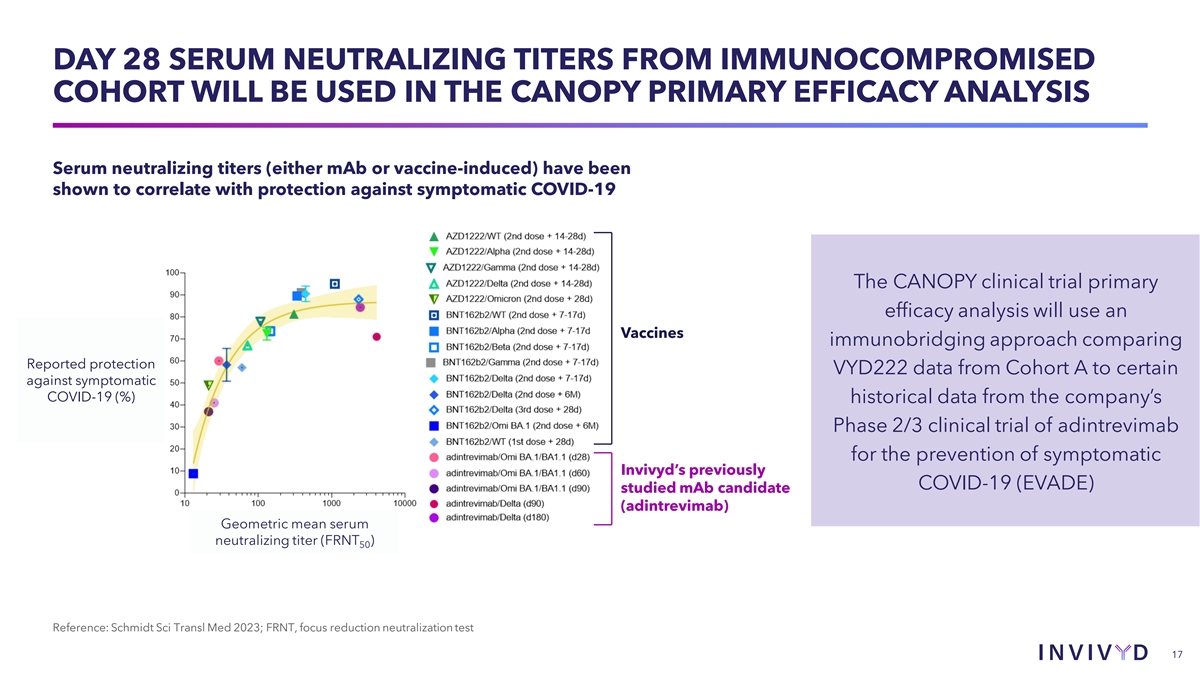 THE CANOPY PHASE 3 CLINICAL TRIAL OF VYD222 IS DESIGNED TO RAPIDLY GENERATE CLINICAL DATA FOR A POTENTIAL EUA VYD222 4500 mg IV (n=300) COHORT A Open Label Immunocompromised // (N=300) Day 1 Day 28 Month 3 Month 12 (Dosing) (Primary (Redosing) (Last visit) efficacy Primary endpoints: endpoint) • Safety/tolerability • Day 28 serum neutralizing titers against relevant SARS-CoV-2 variants VYD222 4500 mg IV (n=300) COHORT B 2:1 Randomization At risk of SARS-CoV-2 // Month 12 Day 1 Month 3 exposure (N=450) (Last visit) (Dosing) (Redosing) Primary endpoint: • Safety/tolerability Placebo IV (n=150) Day 28 titers from Cohort A, plus safety data from both cohorts, expected to enable clinical data package for a potential VYD222 EUA submission for prevention of symptomatic COVID-19 IV, intravenous 16