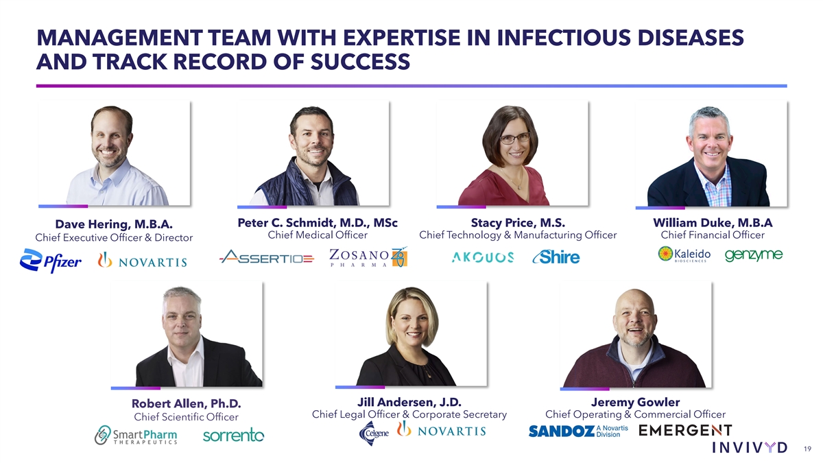 MANAGEMENT TEAM WITH EXPERTISE IN INFECTIOUS DISEASES AND TRACK RECORD OF SUCCESS Peter C. Schmidt, M.D., MSc Stacy Price, M.S. William Duke, M.B.A Dave Hering, M.B.A. Chief Medical Officer Chief Technology & Manufacturing Officer Chief Financial Officer Chief Executive Officer & Director Jill Andersen, J.D. Jeremy Gowler Robert Allen, Ph.D. Chief Legal Officer & Corporate Secretary Chief Operating & Commercial Officer Chief Scientific Officer 19