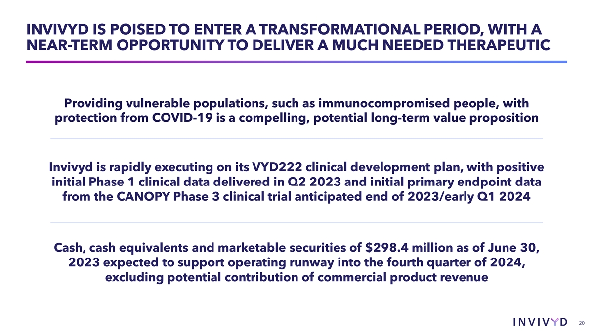 INVIVYD IS POISED TO ENTER A TRANSFORMATIONAL PERIOD, WITH A NEAR-TERM OPPORTUNITY TO DELIVER A MUCH NEEDED THERAPEUTIC Providing vulnerable populations, such as immunocompromised people, with protection from COVID-19 is a compelling, potential long-term value proposition Invivyd is rapidly executing on its VYD222 clinical development plan, with positive initial Phase 1 clinical data delivered in Q2 2023 and initial primary endpoint data from the CANOPY Phase 3 clinical trial anticipated end of 2023/early Q1 2024 Cash, cash equivalents and marketable securities of $298.4 million as of June 30, 2023 expected to support operating runway into the fourth quarter of 2024, excluding potential contribution of commercial product revenue 20