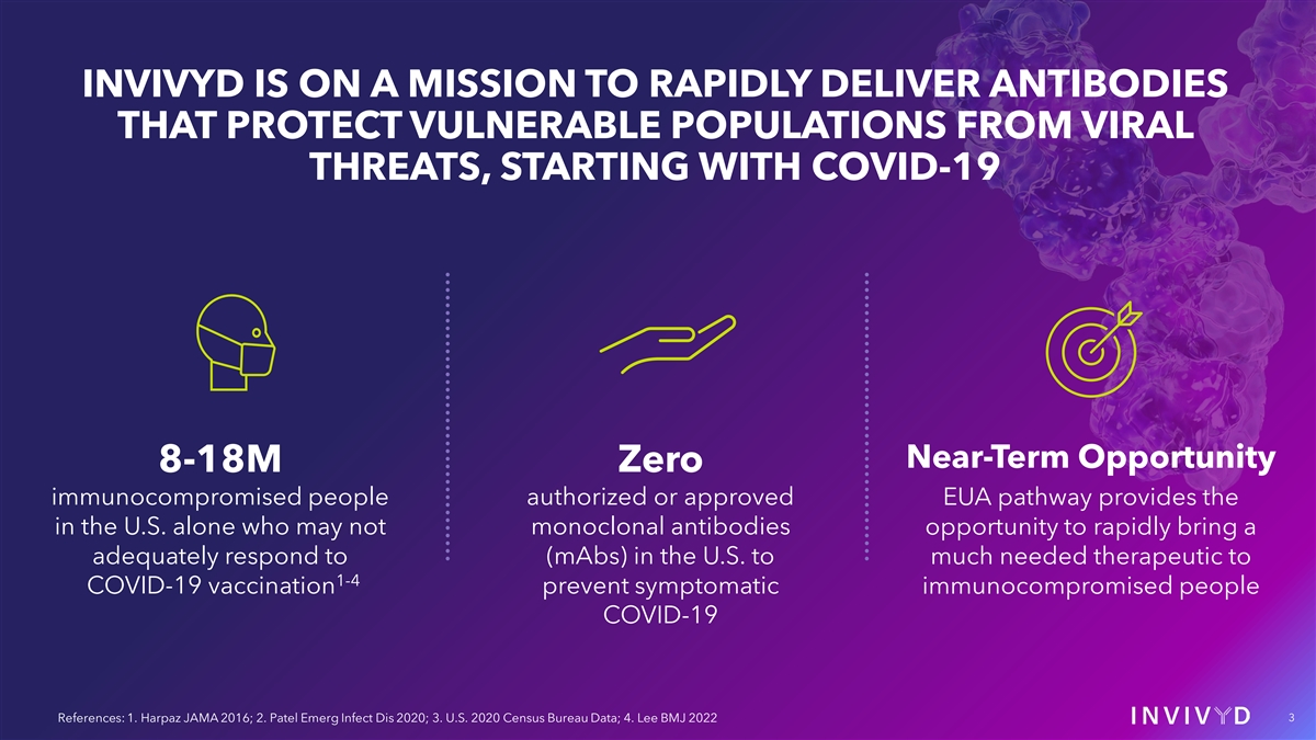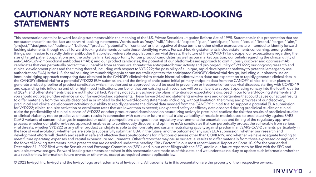 CAUTIONARY NOTE REGARDING FORWARD-LOOKING STATEMENTS This presentation contains forward-looking statements within the meaning of the U.S. Private Securities Litigation Reform Act of 1995. Statements in this presentation that are not statements of historical fact are forward-looking statements. Words such as “may,” “will,” “should,” “expect,” “plan,” “anticipate,” “seek,” “could,” “intend,” “target,” “aim,” “project,” “designed to,” “estimate,” “believe,” “predict,” “potential” or “continue” or the negative of these terms or other similar expressions are intended to identify forward- looking statements, though not all forward-looking statements contain these identifying words. Forward-looking statements include statements concerning, among other things, our mission to rapidly deliver antibodies that protect vulnerable populations from viral threats; the future of the COVID-19 landscape; our expectations regarding the size of target patient populations and the potential market opportunity for our product candidates, as well as our market position; our beliefs regarding the clinical utility of anti-SARS-CoV-2 monoclonal antibodies (mAbs) and our product candidates; the potential of our platform-based approach to continuously discover and optimize mAb candidates that can perpetually protect the vulnerable from serious viral threats; the anticipated broad activity and prolonged utility of VYD222; our ongoing research and clinical development plans and the timing thereof, including with respect to VYD222; the possibility of a unique, rapid development pathway to potential emergency use authorization (EUA) in the U.S. for mAbs using immunobridging via serum neutralizing titers; the anticipated CANOPY clinical trial design, including our plans to use an immunobridging approach comparing data obtained in the CANOPY clinical trial to certain historical adintrevimab data; our expectation to rapidly generate clinical data in the CANOPY clinical trial for a potential VYD222 EUA submission, and the timing of anticipated initial primary endpoint data from the CANOPY clinical trial; our plans to generate a robust pipeline of product candidates which, if authorized or approved, could be used in prevention or treatment of serious viral diseases, starting with COVID-19 and expanding into influenza and other high-need indications; our belief that our existing cash resources will be sufficient to support operating runway into the fourth quarter of 2024; and other statements that are not historical fact. We may not actually achieve the plans, intentions or expectations disclosed in our forward-looking statements and you should not place undue reliance on our forward-looking statements. These forward-looking statements involve risks and uncertainties that could cause our actual results to differ materially from the results described in or implied by the forward-looking statements, including, without limitation: the timing and progress of our discovery, preclinical and clinical development activities; our ability to rapidly generate the clinical data needed from the CANOPY clinical trial to support a potential EUA submission for VYD222; clinical trial site activation or enrollment rates that are lower than expected; unexpected safety or efficacy data observed during preclinical studies or clinical trials; the predictability of clinical success of VYD222 or other product candidates based on neutralizing activity in preclinical studies; the risk that results of preclinical studies or clinical trials may not be predictive of future results in connection with current or future clinical trials; variability of results in models used to predict activity against SARS- CoV-2 variants of concern; changes in expected or existing competition; changes in the regulatory environment; the uncertainties and timing of the regulatory approval process; whether our platform-based approach enables us to continuously discover and optimize mAb candidates that can perpetually protect the vulnerable from serious viral threats; whether VYD222 or any other product candidate is able to demonstrate and sustain neutralizing activity against predominant SARS-CoV-2 variants, particularly in the face of viral evolution; whether we are able to successfully submit an EUA in the future, and the outcome of any such EUA submission; whether our research and development efforts will identify and result in safe and effective therapeutic options for infectious diseases other than COVID-19; and whether we have adequate funding to meet future operating expenses and capital expenditure requirements. Other factors that may cause our actual results to differ materially from those expressed or implied in the forward-looking statements in this presentation are described under the heading “Risk Factors” in our most recent Annual Report on Form 10-K for the year ended December 31, 2022 filed with the Securities and Exchange Commission (SEC), and in our other filings with the SEC, and in our future reports to be filed with the SEC and available at www.sec.gov. Forward-looking statements contained in this presentation are made as of this date, and we undertake no duty to update such information whether as a result of new information, future events or otherwise, except as required under applicable law. © 2023 Invivyd, Inc. Invivyd and the Invivyd logo are trademarks of Invivyd, Inc. All trademarks in this presentation are the property of their respective owners. 2