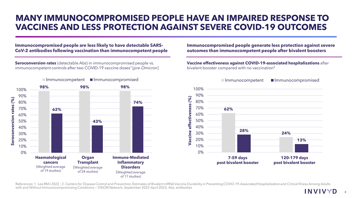 INVIVYD IS ON A MISSION TO RAPIDLY DELIVER ANTIBODIES THAT PROTECT VULNERABLE POPULATIONS FROM VIRAL THREATS, STARTING WITH COVID-19 Near-Term Opportunity 8-18M Zero immunocompromised people authorized or approved EUA pathway provides the in the U.S. alone who may not monoclonal antibodies opportunity to rapidly bring a adequately respond to (mAbs) in the U.S. to much needed therapeutic to 1-4 COVID-19 vaccination prevent symptomatic immunocompromised people COVID-19 References: 1. Harpaz JAMA 2016; 2. Patel Emerg Infect Dis 2020; 3. U.S. 2020 Census Bureau Data; 4. Lee BMJ 2022 3